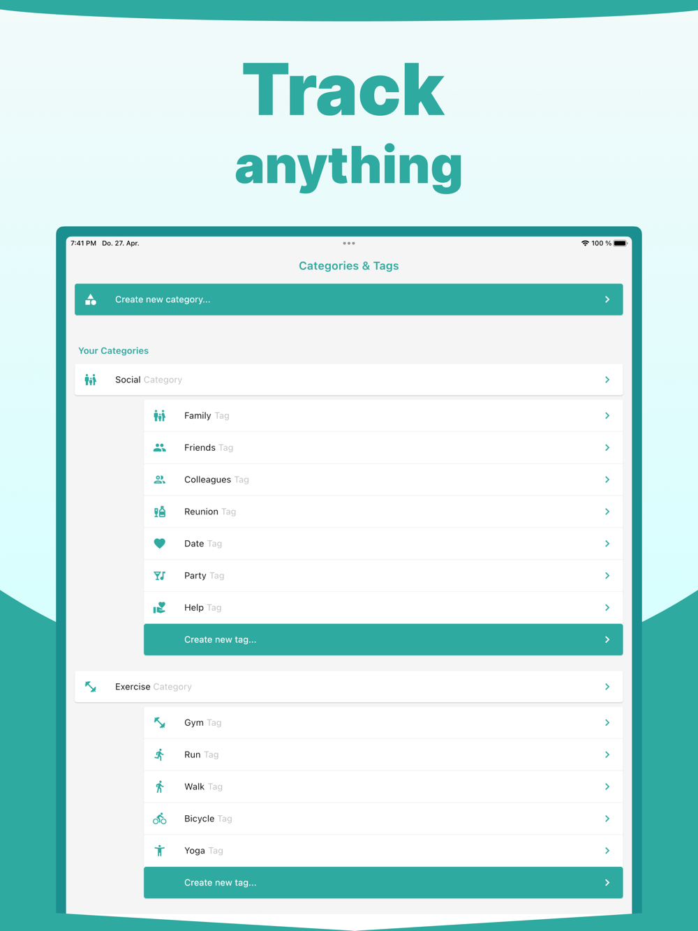 - Personalize your activities by editing or creating custom categories and tags