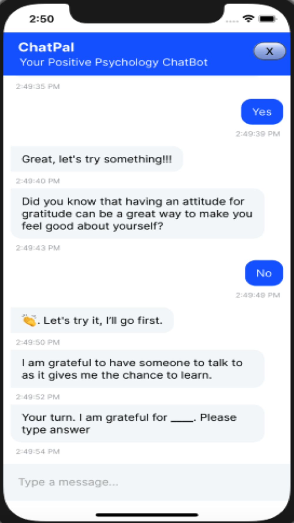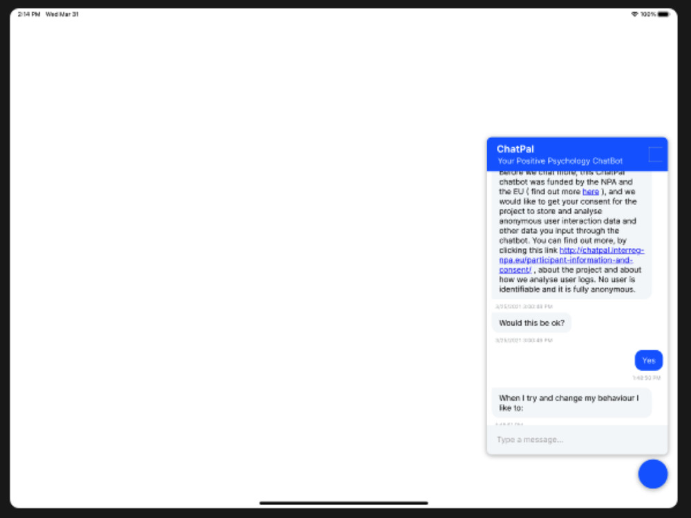 ChatPal is a free and easy to use mental health app that you can use to support your mental health. The app is designed to provide positive psychology activities that empower you to enhance your overall health and wellness. By focusing on what is important to you it provides your emotions, engagement daily tasks, personal, relationships, meaning, accomplishments, and your physical health.