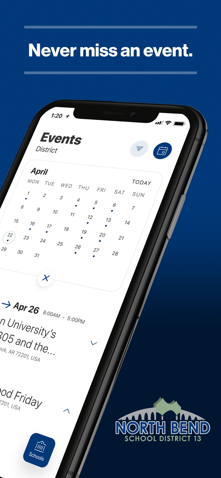 The event section shows a list of events throughout the district. Users can add an event to your calendar to share the event with friends and family with one tap.