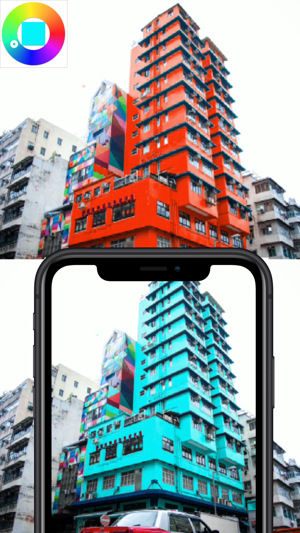 Just select a hue and touch at anything on the camera screen and see that thing change color live on your iphone.