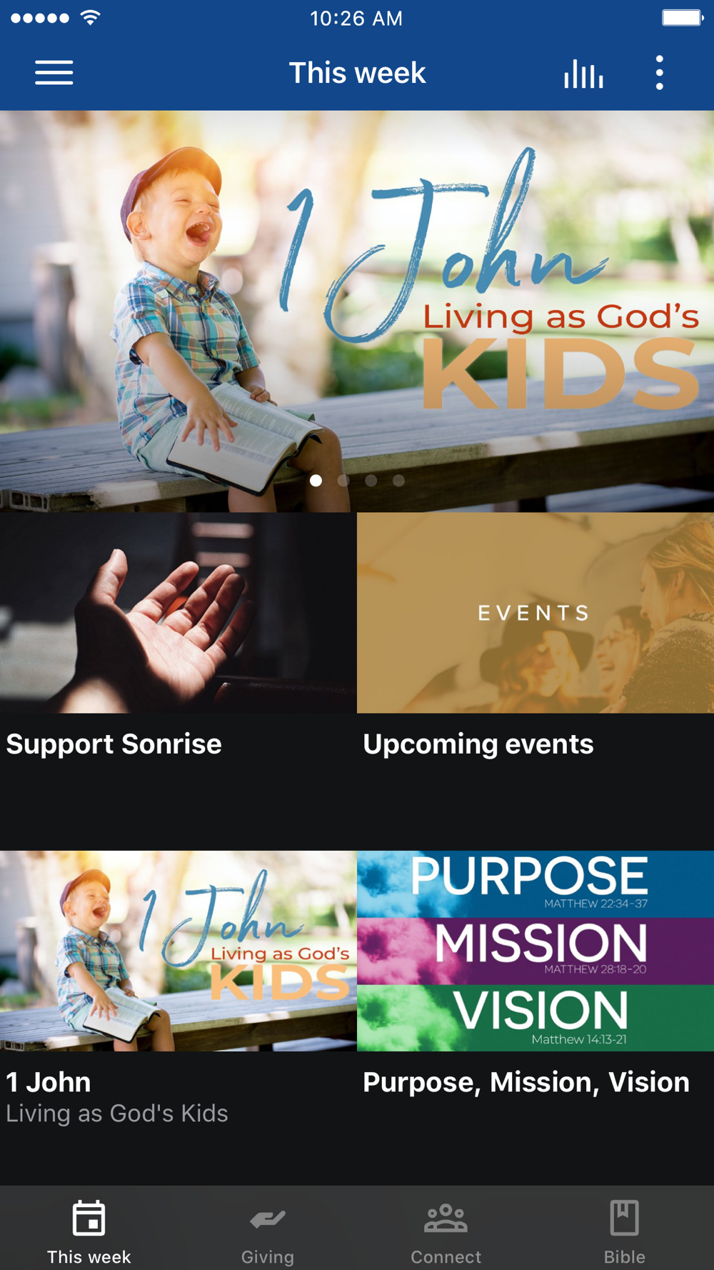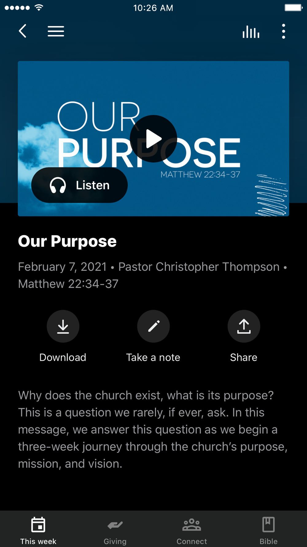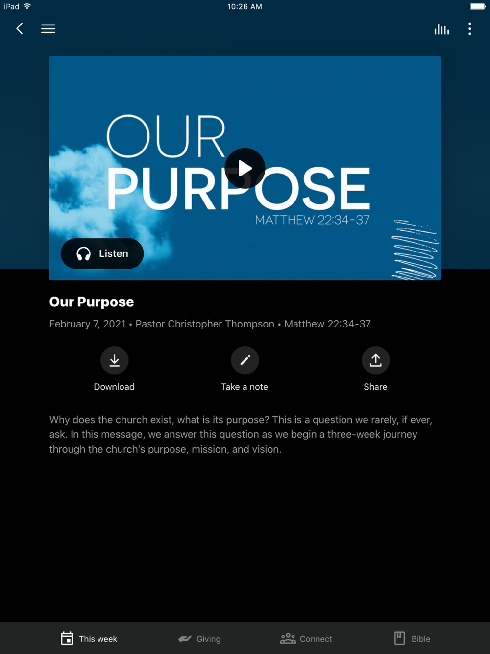This app will help you stay connected with the day-to-day life of our church. With this app, you can: watch or listen to past messages, stay up to date with push notifications; share your favorite messages via Twitter, Facebook, or email; and download messages for offline listening.