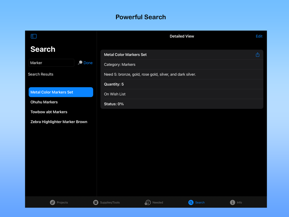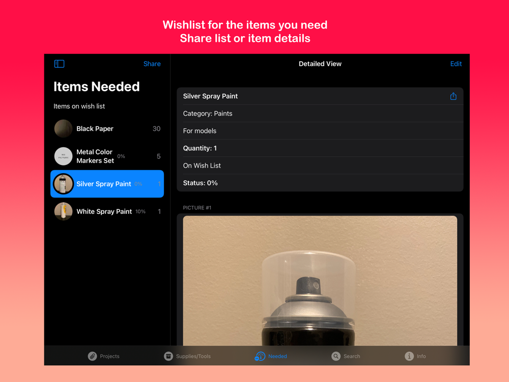 Quick access to your inventory of hobby supplies and projects. You can also add notes about your hobby projects, and/or any details you want to track.