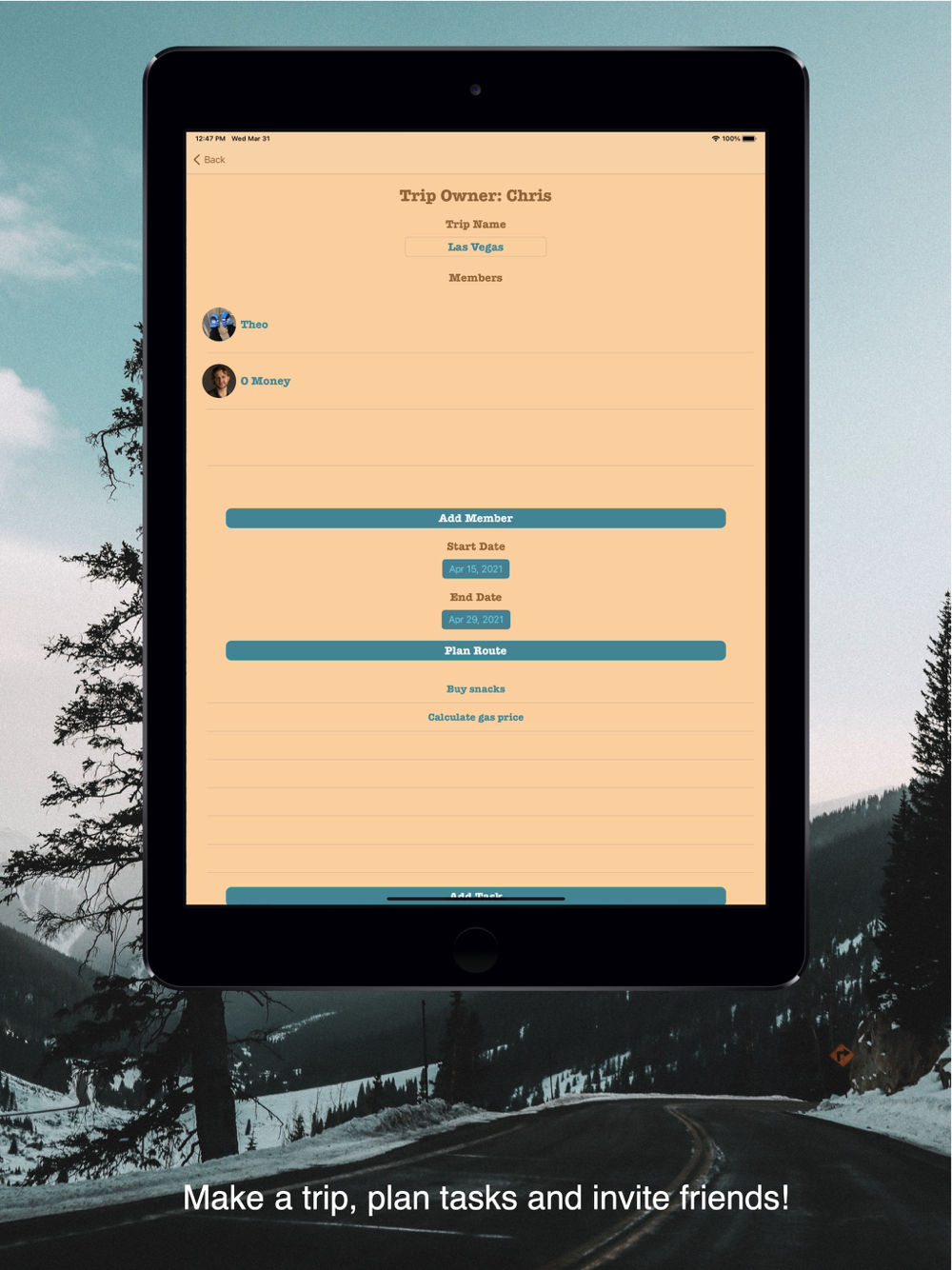 Easily connect with your friends, add them to trips and plan with ease. Organize tasks so you don't forget anything and be sure to checkout the route of your trip in the map!