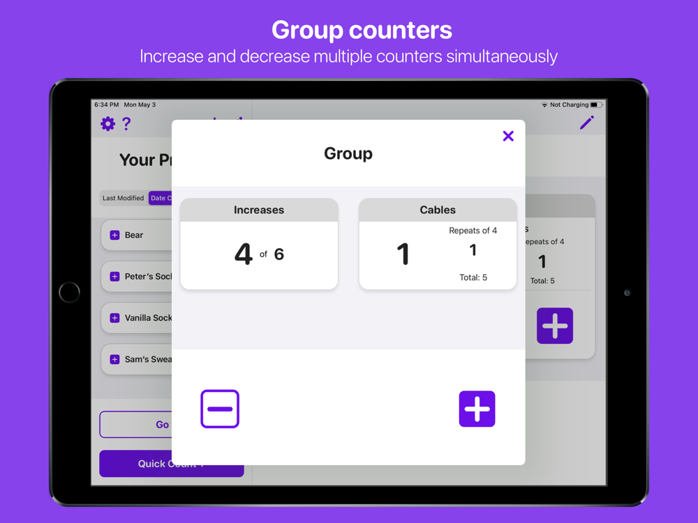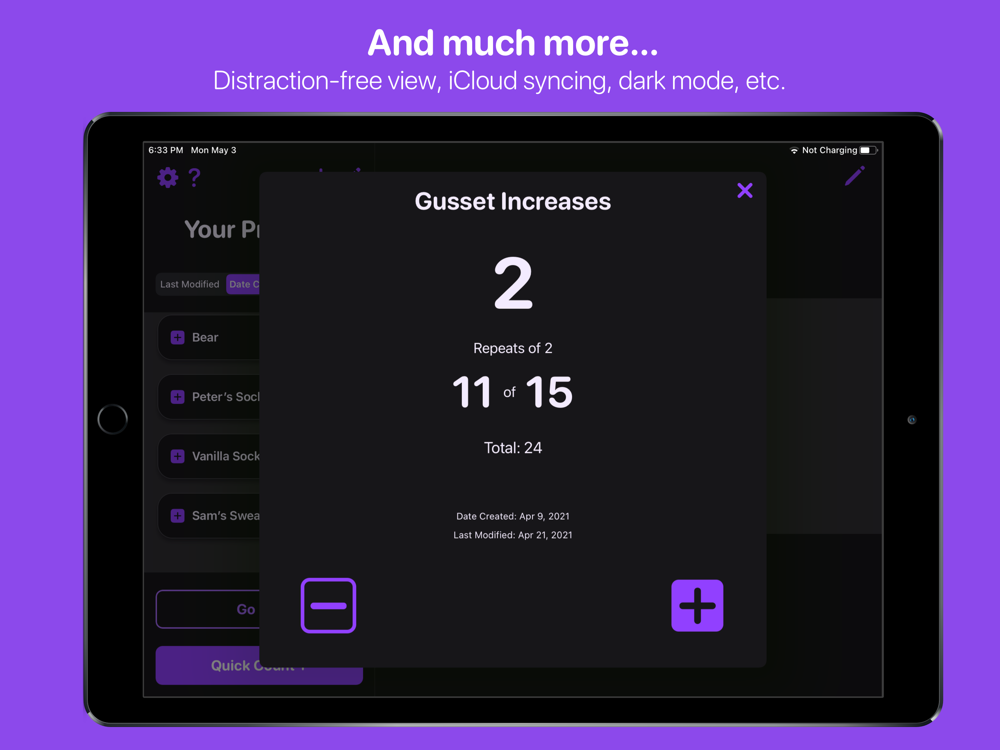 * Sync Between Devices: Alicia's Row Counter uses iCloud to sync your projects across devices.