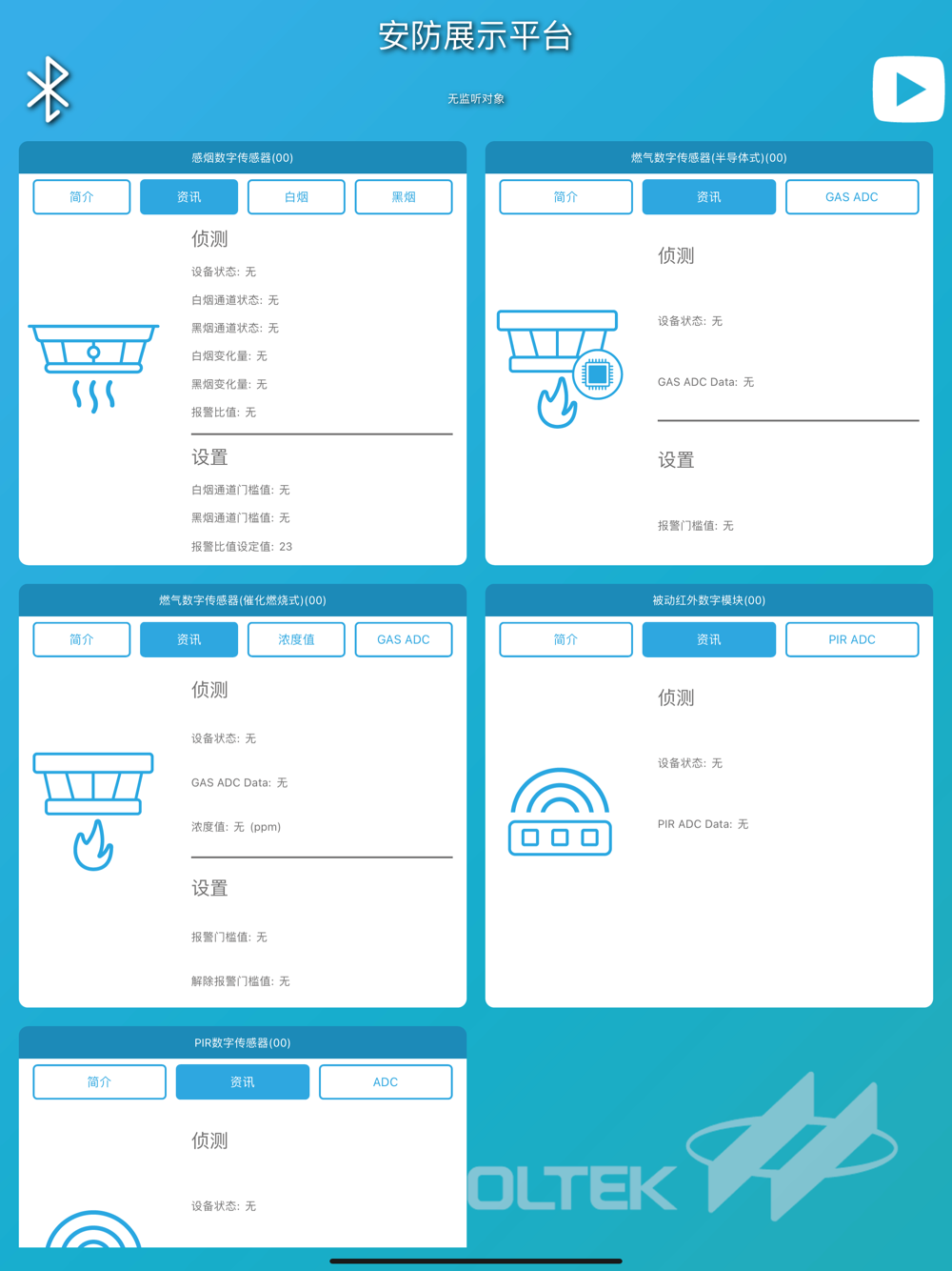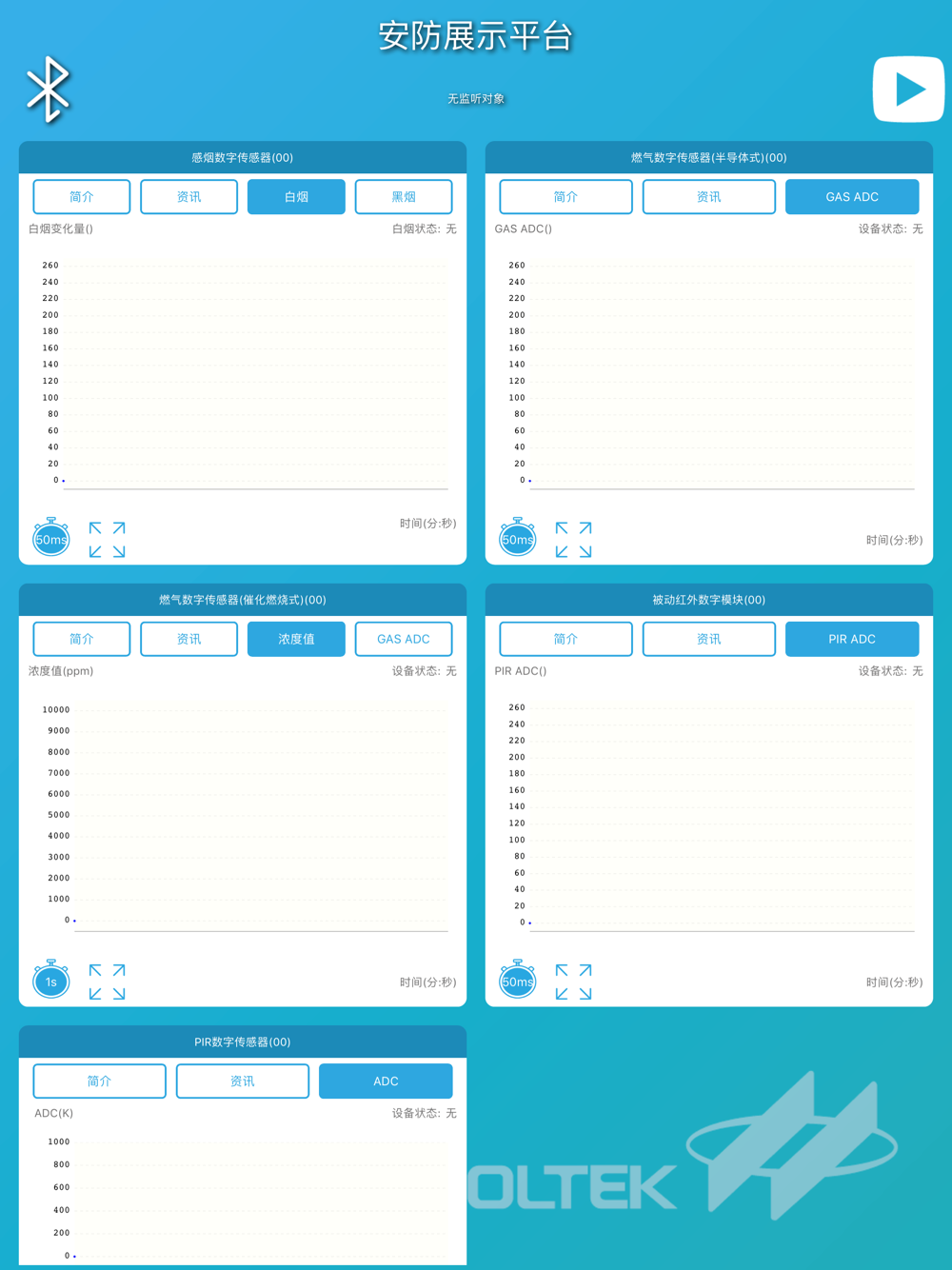 APP通过蓝牙广播,监听安防展示平台所广播的模块讯息,并在APP上显示模块参数曲线以及模块资讯.