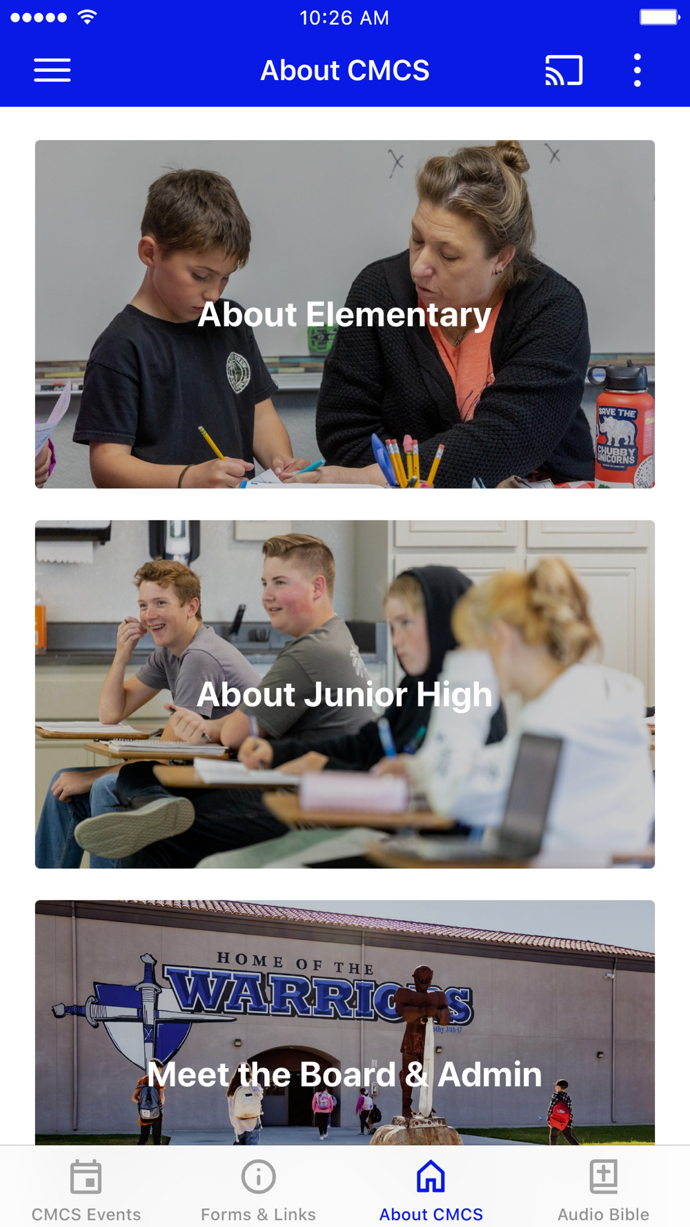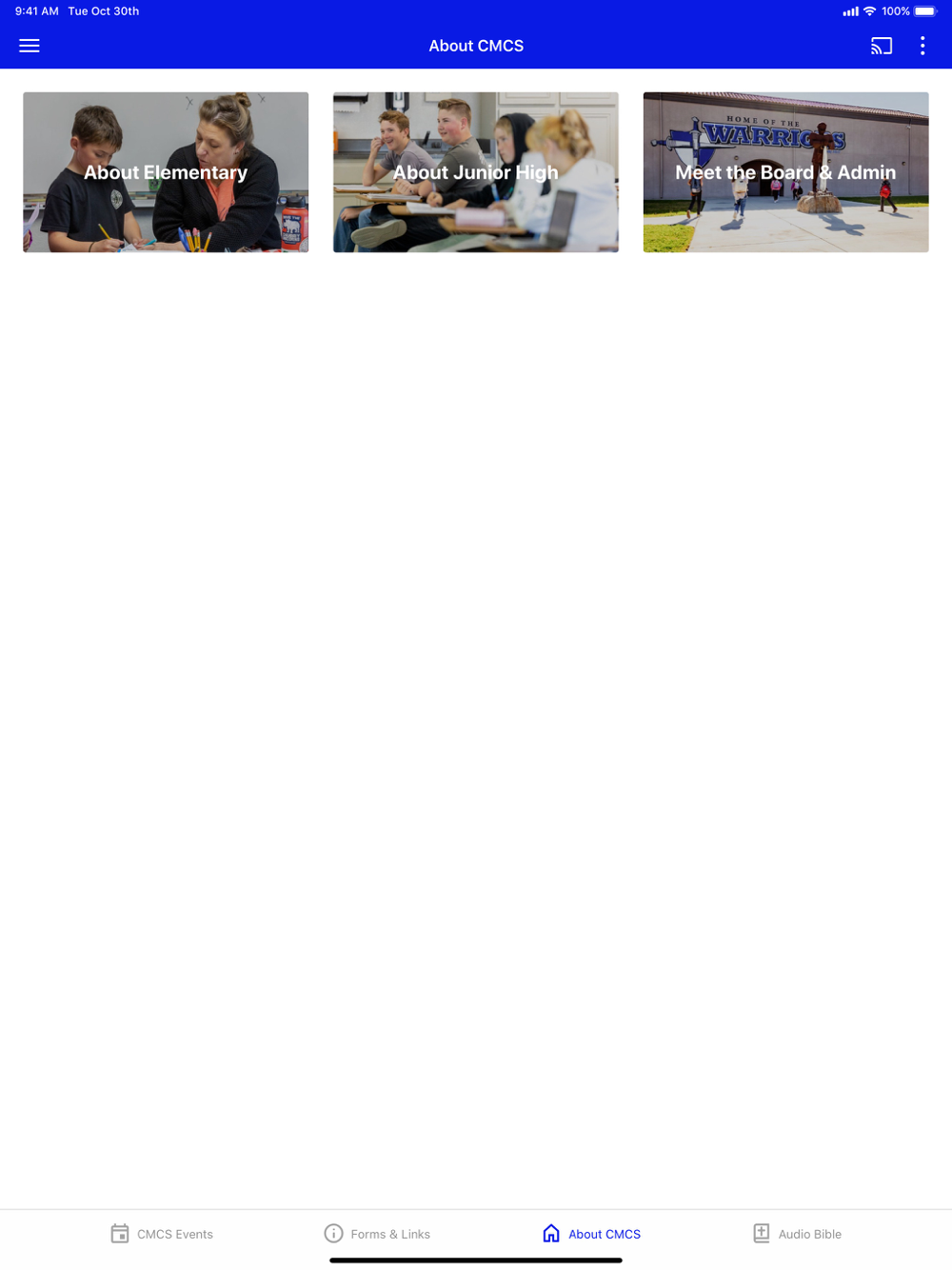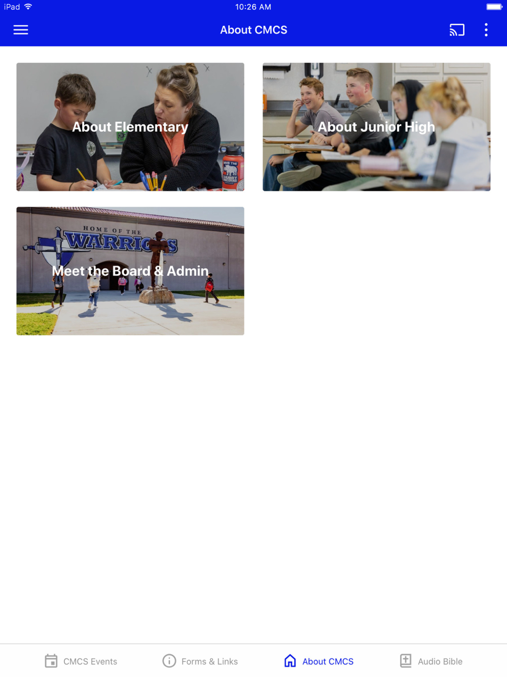 This app will help you stay connected with the day-to-day life of our school. With this app you can: stay up to date with push notifications; access important forms and links; and find out what CMCS is all about!
