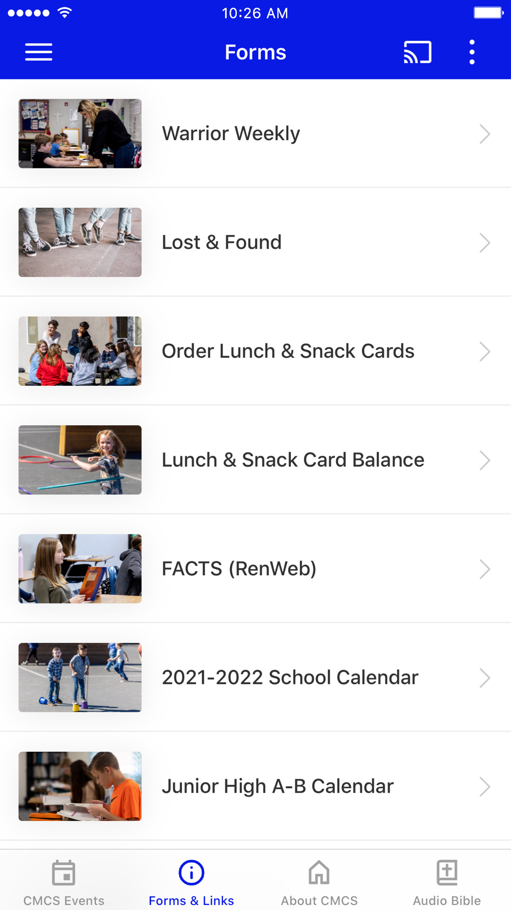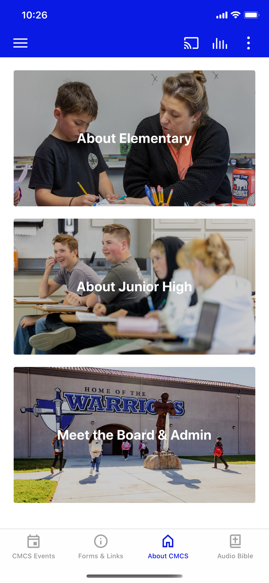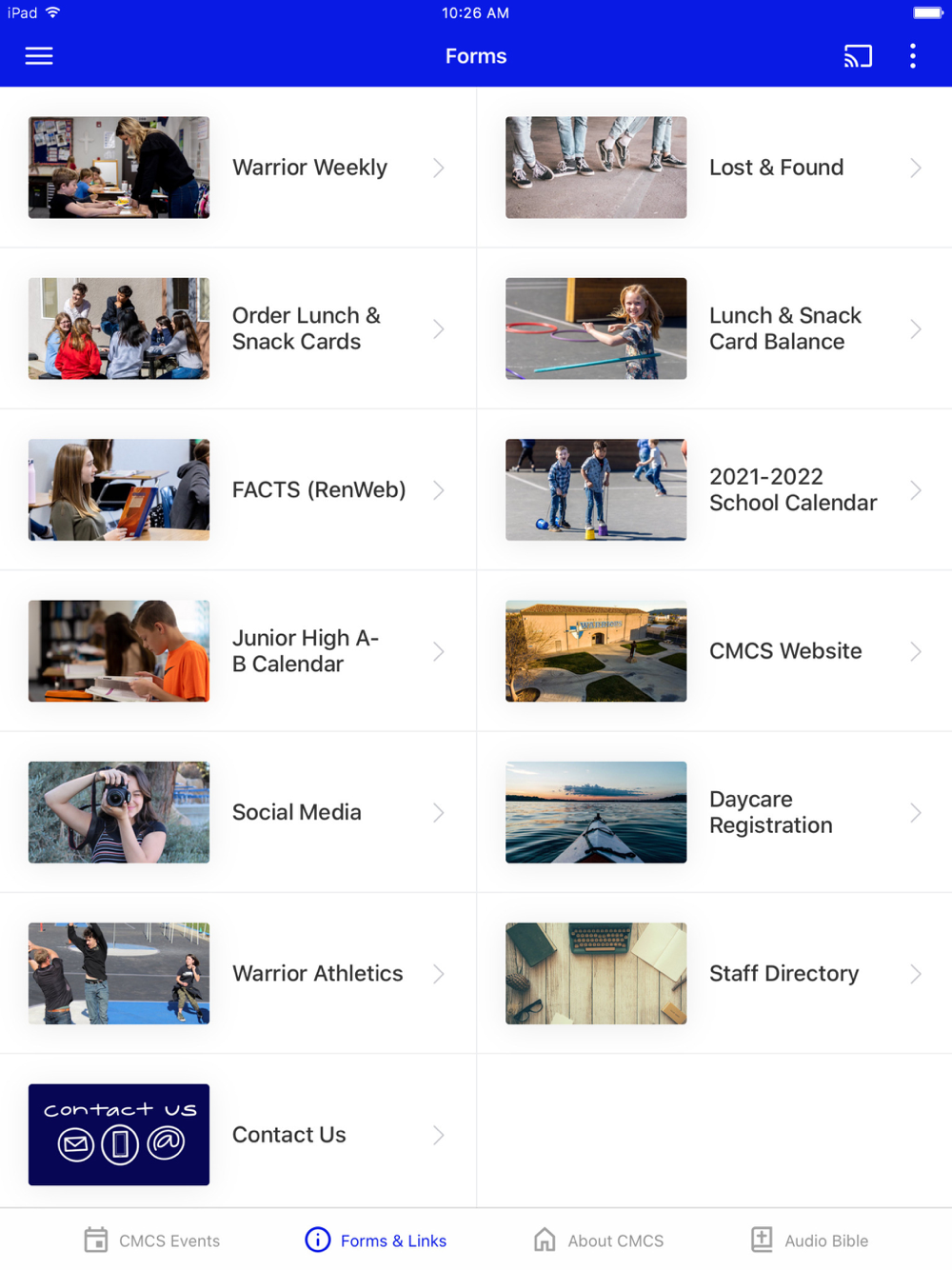 This app will help you stay connected with the day-to-day life of our school. With this app you can: stay up to date with push notifications; access important forms and links; and find out what CMCS is all about!