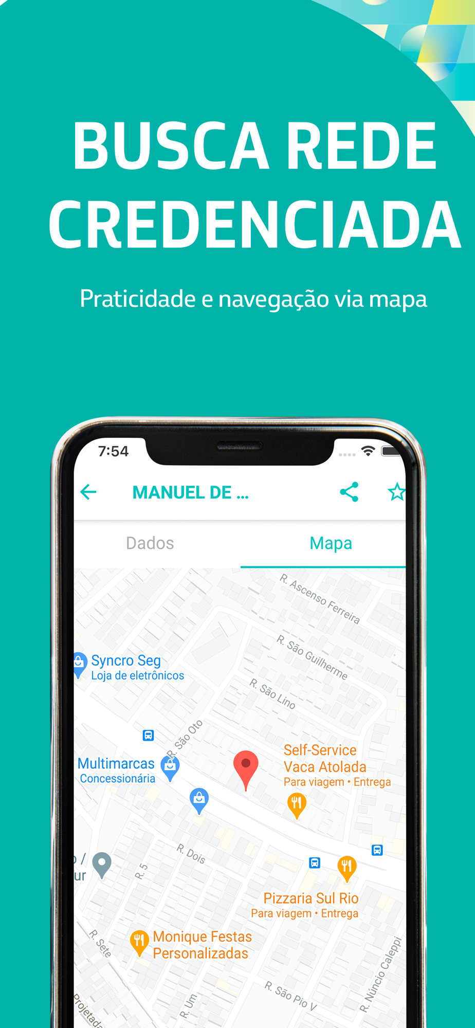 - Consulta à rede credenciada por tipo de serviço ou busca por geolocalização