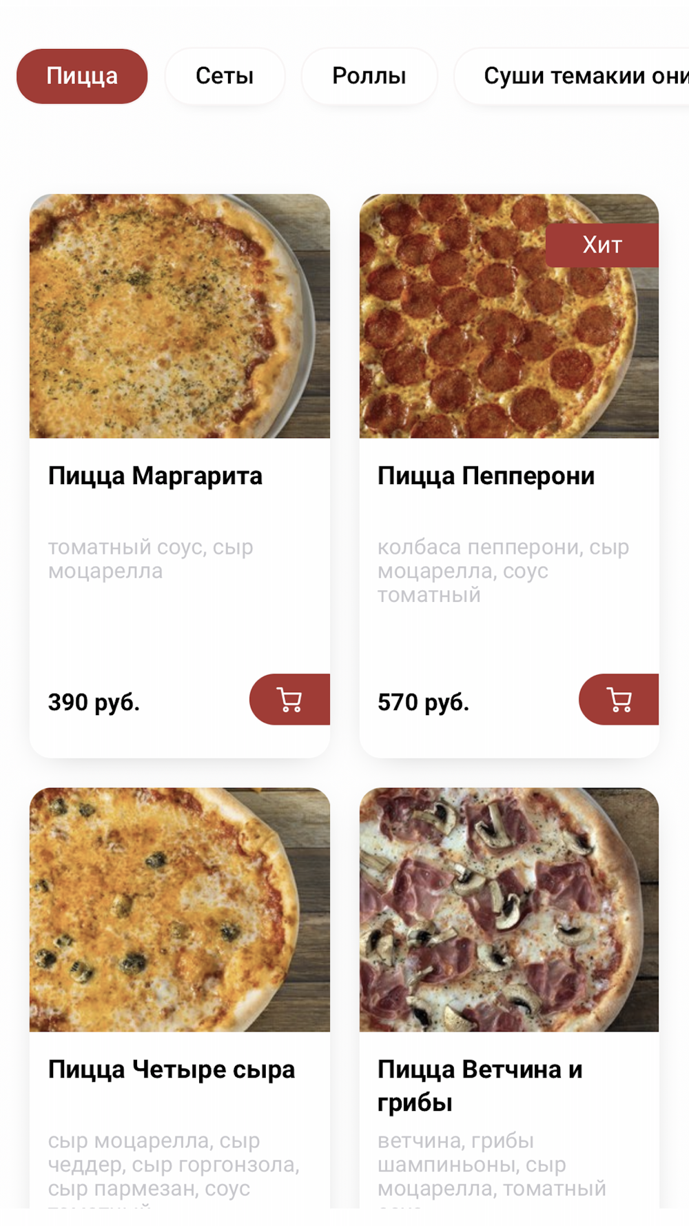 Как сделать заказ в приложении “Ди Паоло”: выберите понравившиеся позиции из меню, добавьте их в корзину и перейдите на экран оформления заказа (по нажатию на иконку корзины).