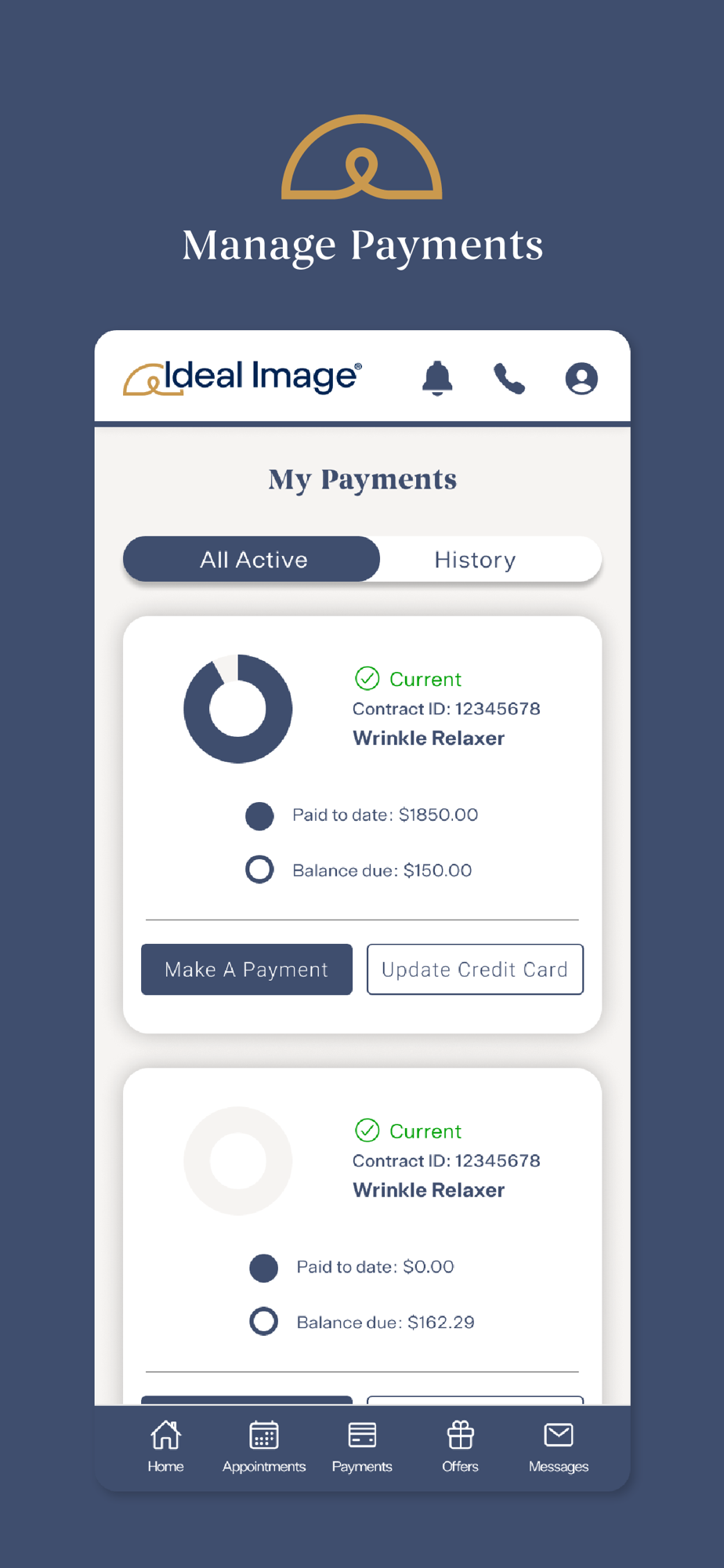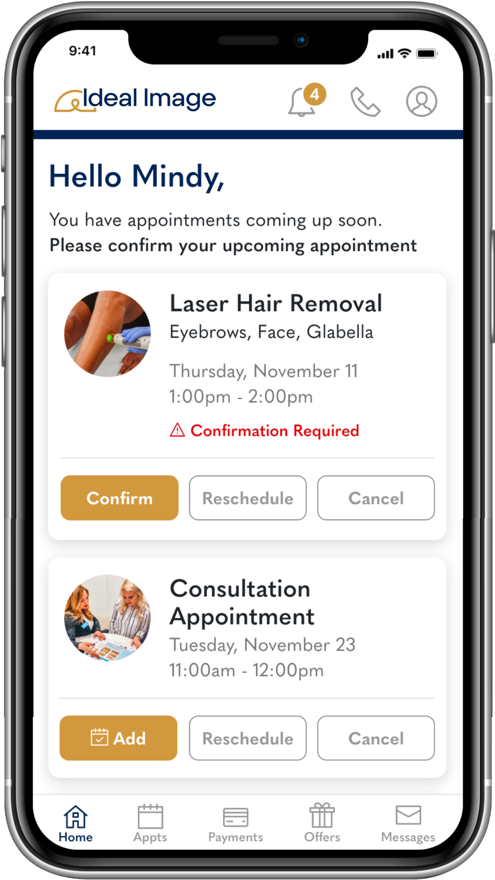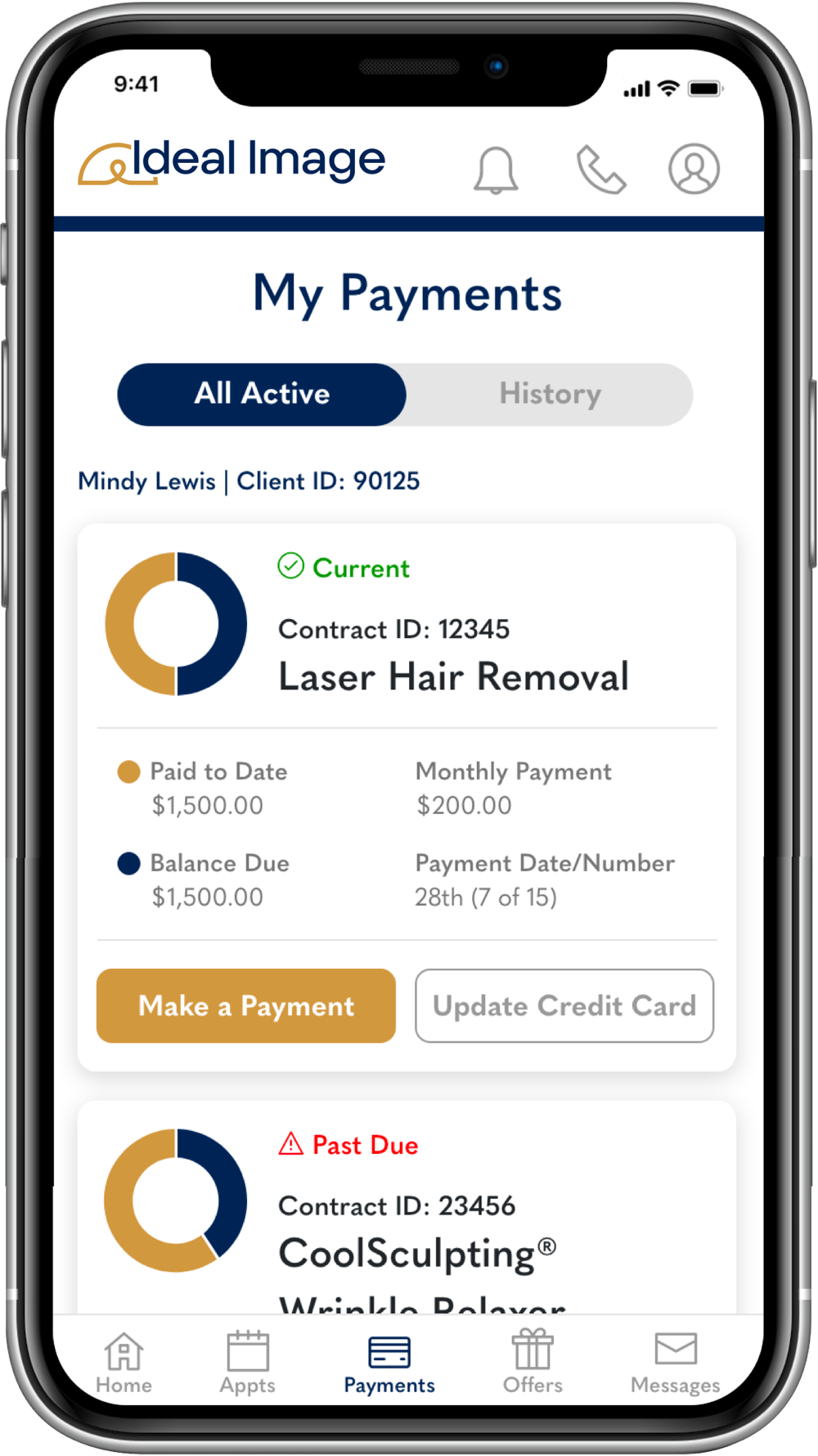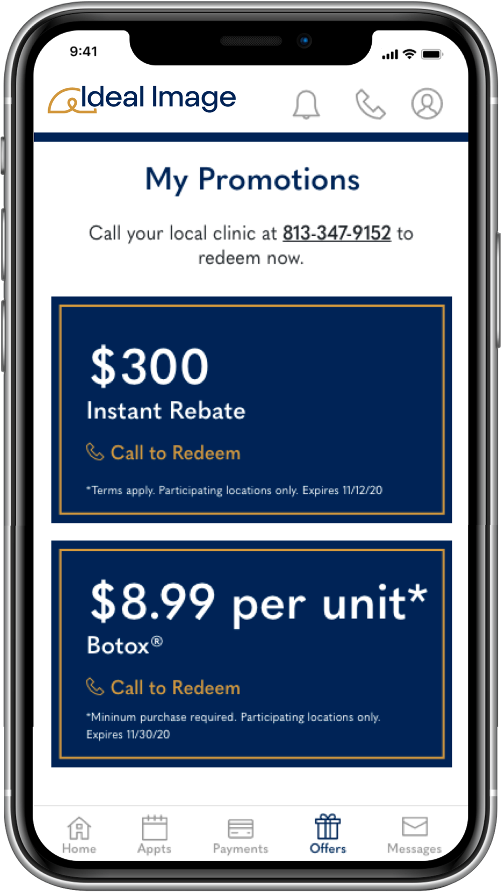 With the Ideal Image app, our clients can easily manage upcoming treatment appointments, make payments, and redeem promotional offers – all from a mobile device.
