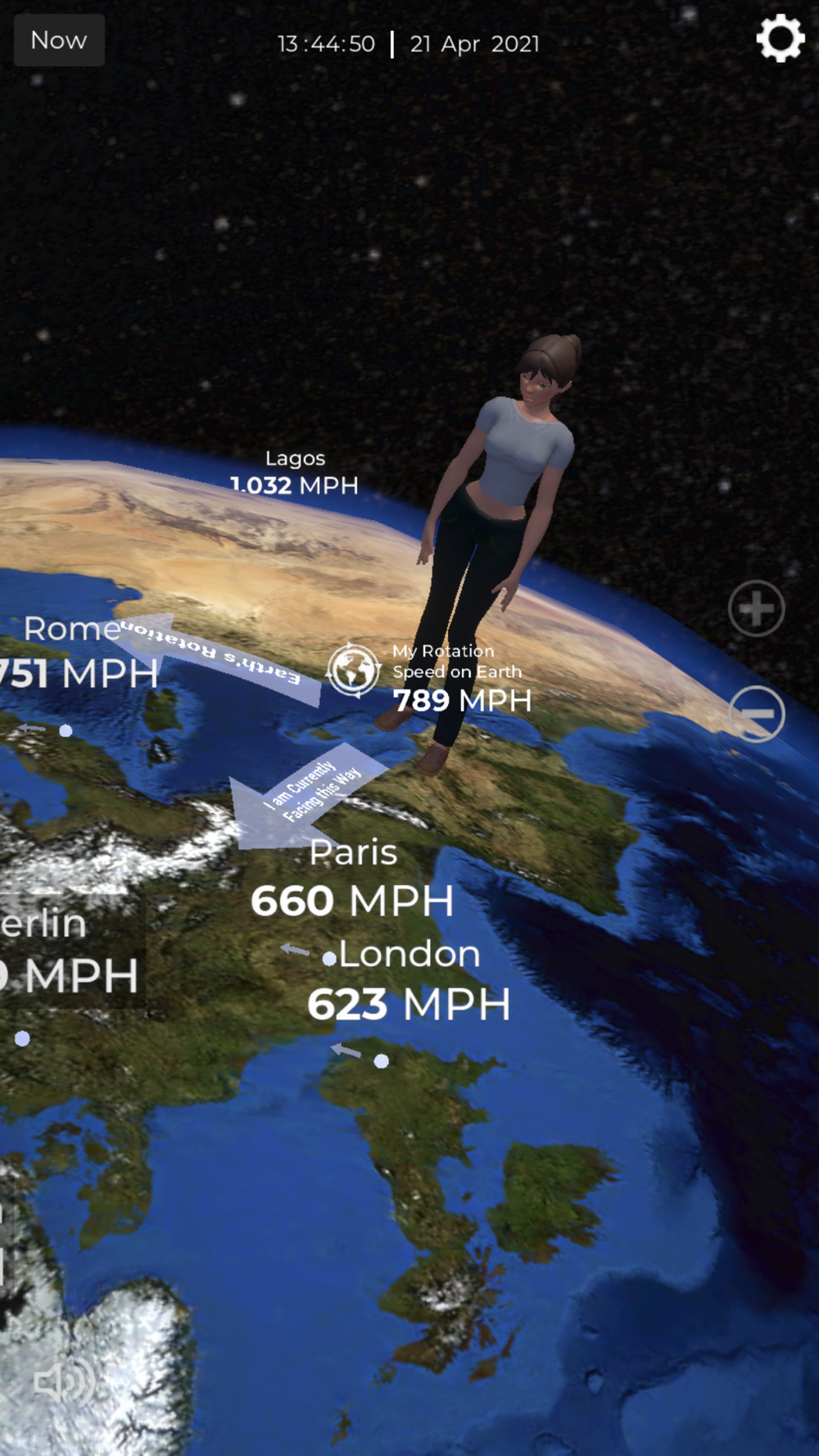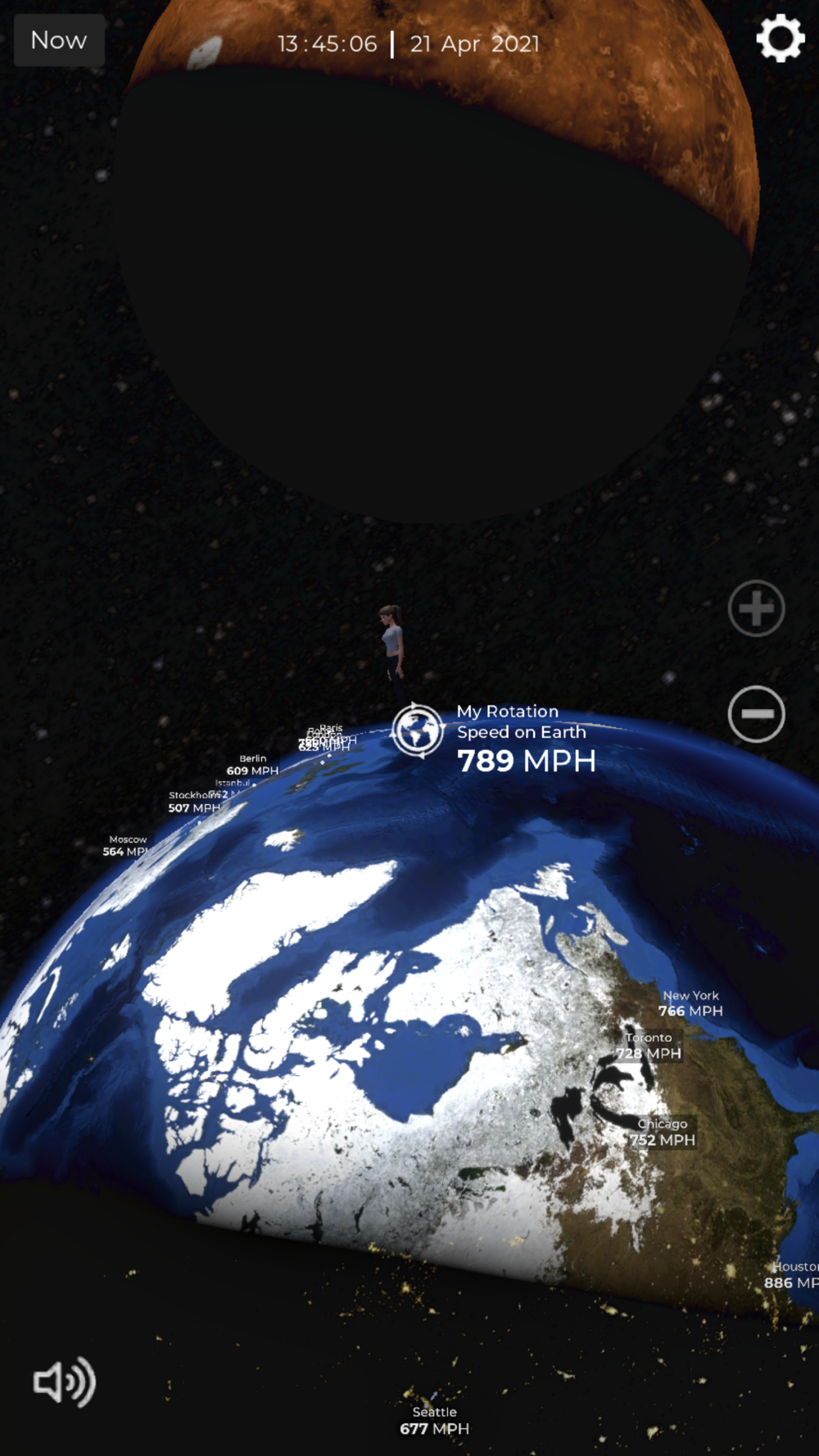 Your controls: Rotate, Zoom in/out (pinch or +/-), Fast Forward Mode, Swipe, Earth View, Solar System View, Planet Info, Cinematic Mode, Planet Labels, City Labels, Background Sound or Music, Avatar gender, Units of measurement, Calendar.