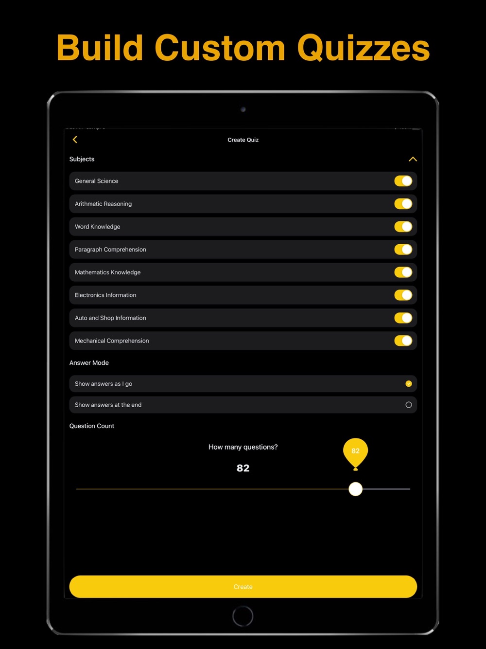 Practice over 1000+ ASVAB questions for marine, navy, air force and military test prep. Customize how many free practice questions you want to study regards to your study schedule. Practice questions covered AFQT and other sections include: General Science, Arithmetic Reasoning, Word Knowledge, Paragraph Comprehension, Mathematics Knowledge, Electronics Information, Auto and Shop Comprehension and Assembling Objects.