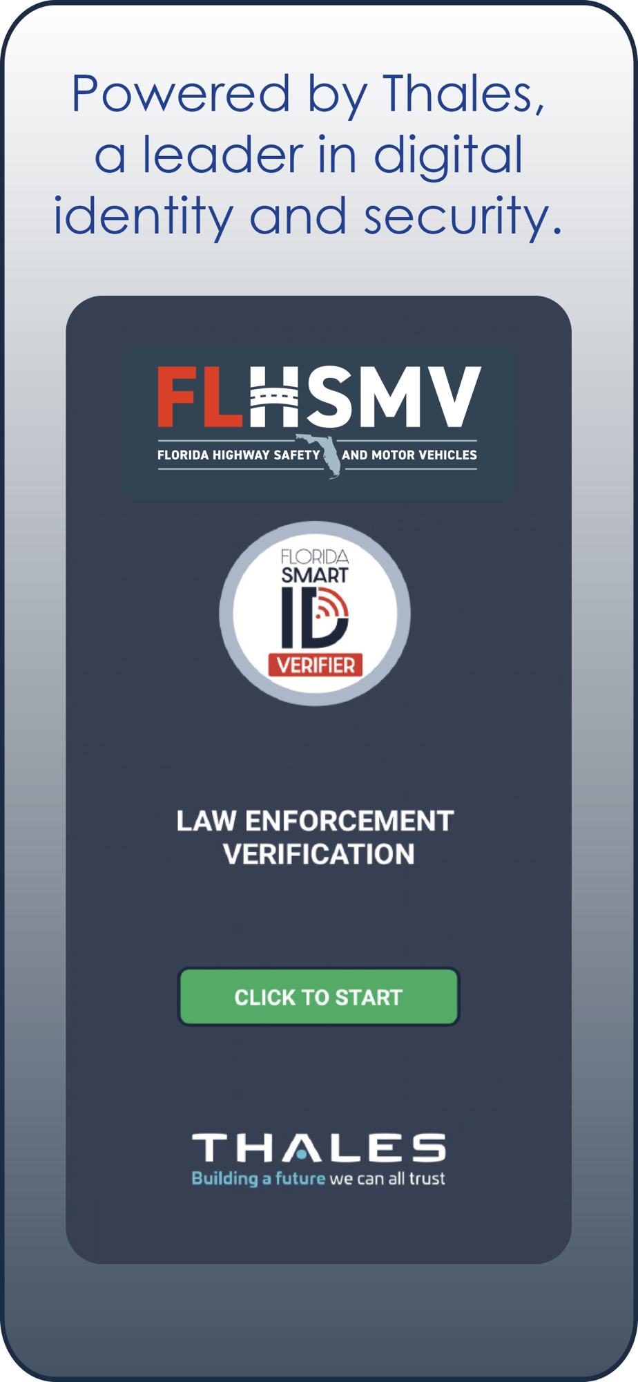 Florida Smart ID LE Verifier by Thales is the official app for Law Enforcement officers to authenticate a Florida Smart ID for proof of identity and driving privileges.