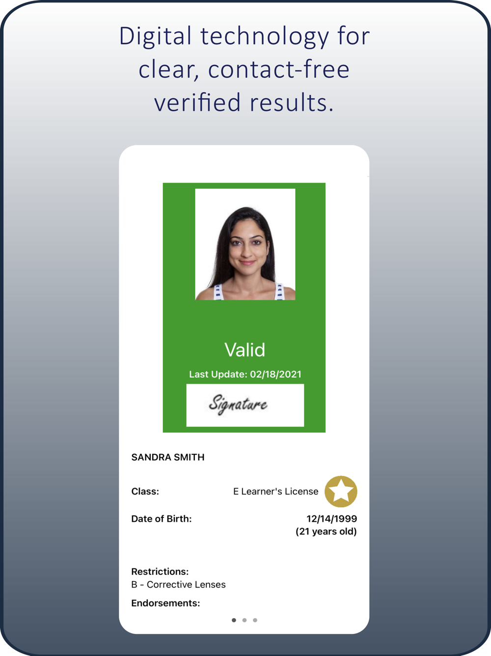 When using Florida Smart ID LE Verifier during a traffic stop, all the pertinent information is securely transmitted through a quick scan of a code displayed on the individual’s Florida Smart ID. The advanced digital verification technology provides a clear display of identity verification results in seconds.
