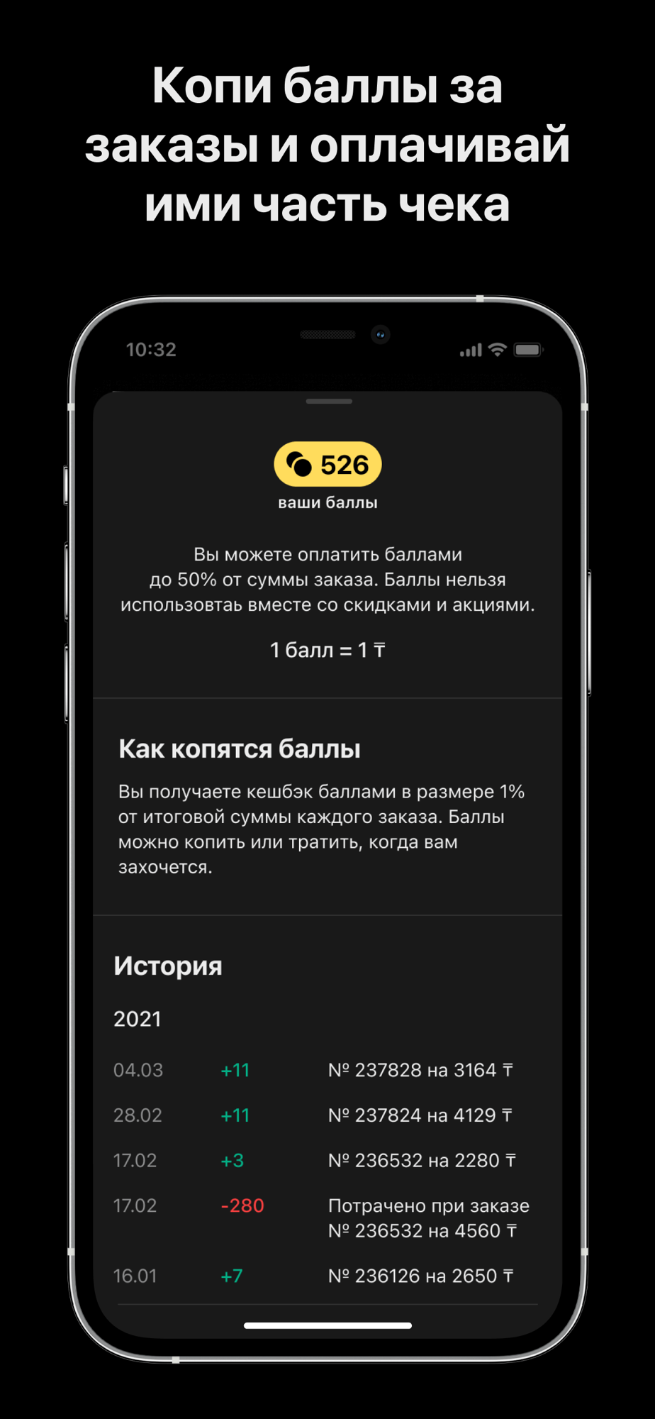 Делайте заказ и получайте от 5% до 15% баллов в виде кэшбэка. Меняйте баллы на еду и напитки в мобильном приложении.