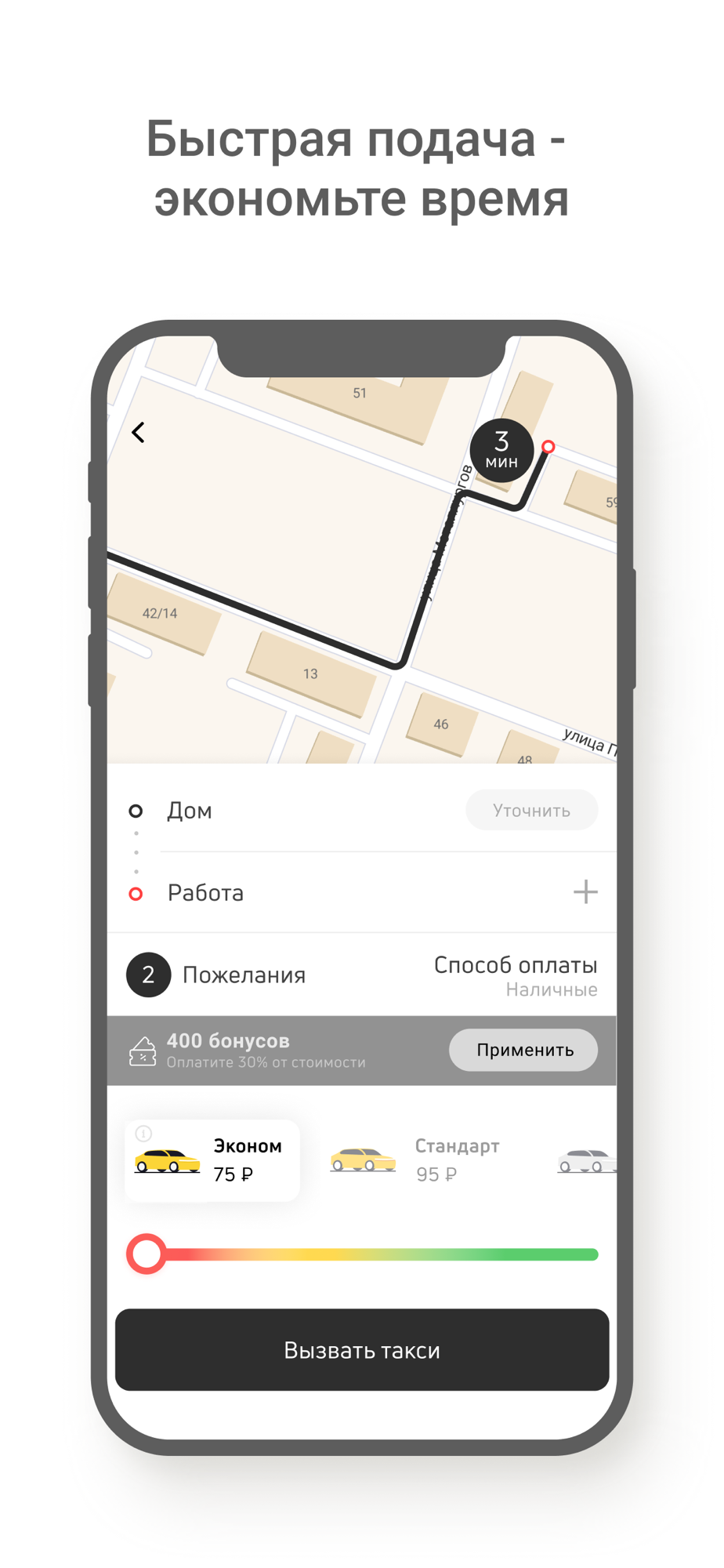 С помощью удобного ползунка вы можете снижать цену поездки или поднять ее, если хотите ускорить поиск машины.
