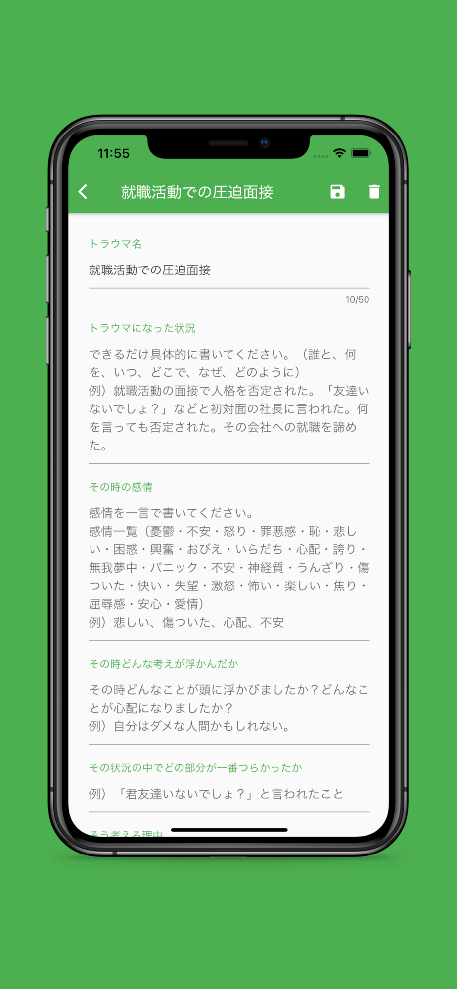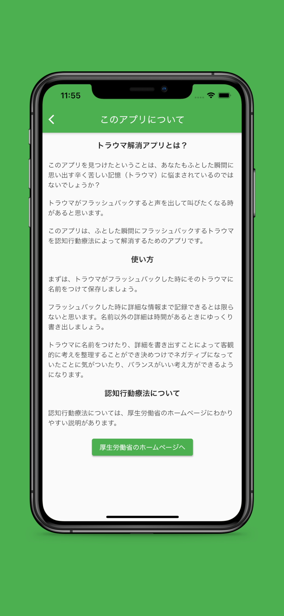 このアプリは、ふとした瞬間にフラッシュバックするトラウマを認知行動療法によって解消するためのアプリです。
