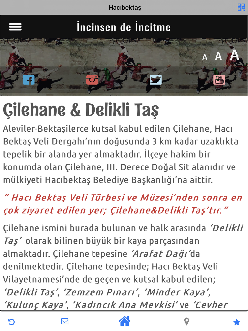 Hacıbektaş ve Hacı Bektaş Veli hakkında bulabileceğiniz en kapsamlı içerik uygulamamızda yer almaktadır. Yazılar, bilgiler, fotoğraflar, videolar vb. bir çok doküman sayfalarımızda yer almaktadır.