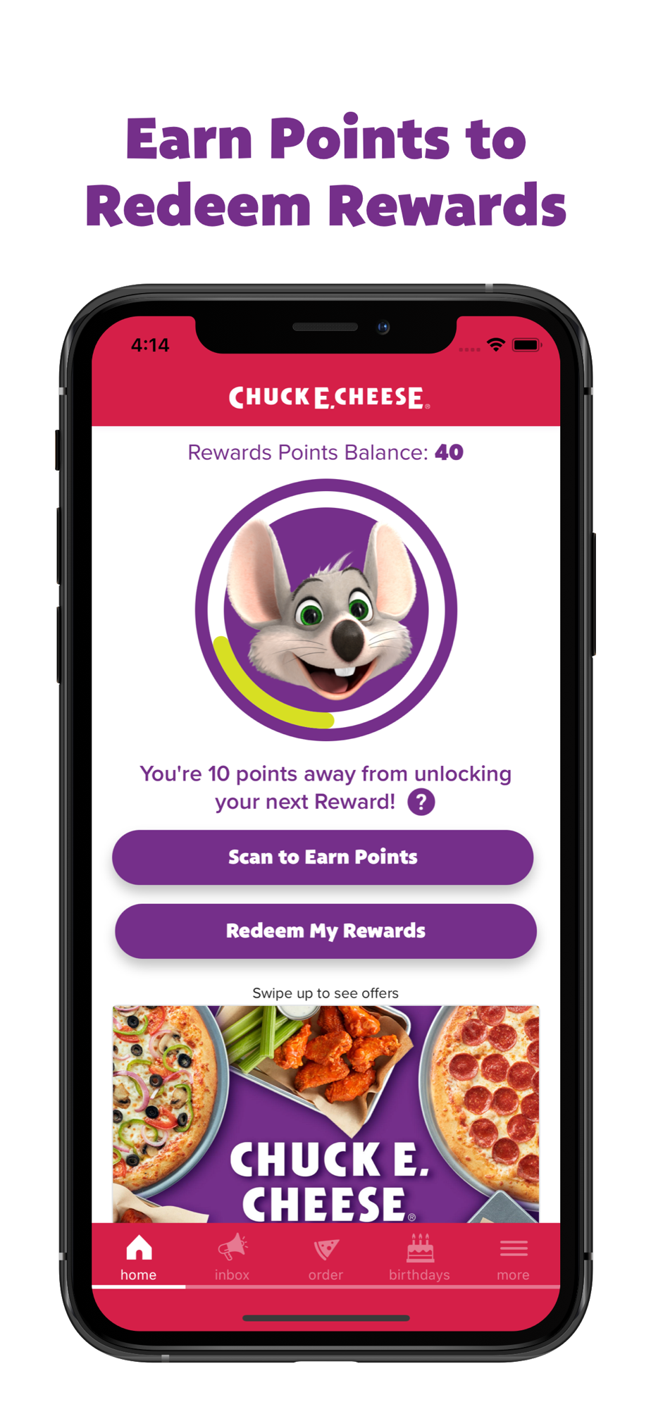 • Join Chuck E. Cheese Rewards to get special offers, unlock exciting prizes and more. You’ll earn Rewards Points for every dollar you spend, and even get special birthday treats for you and your family!