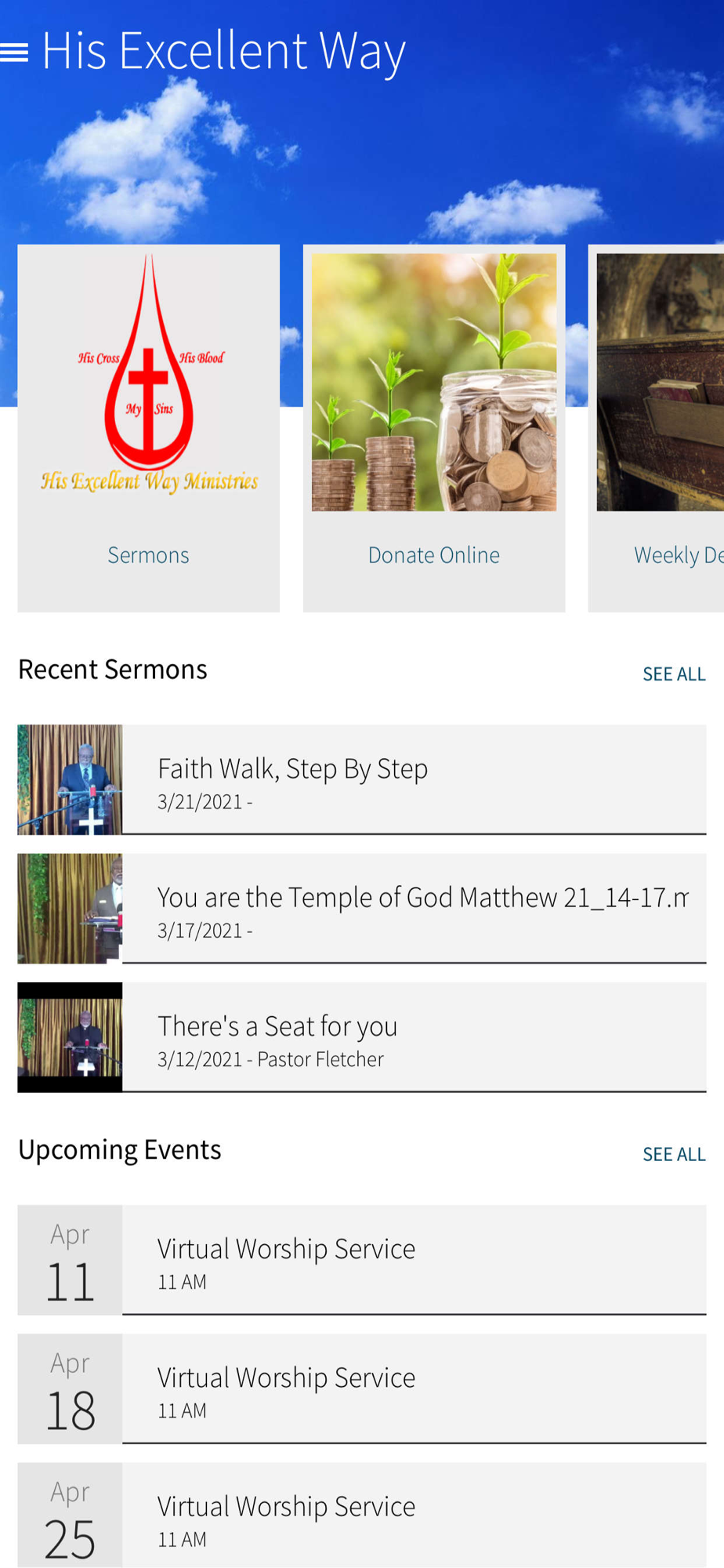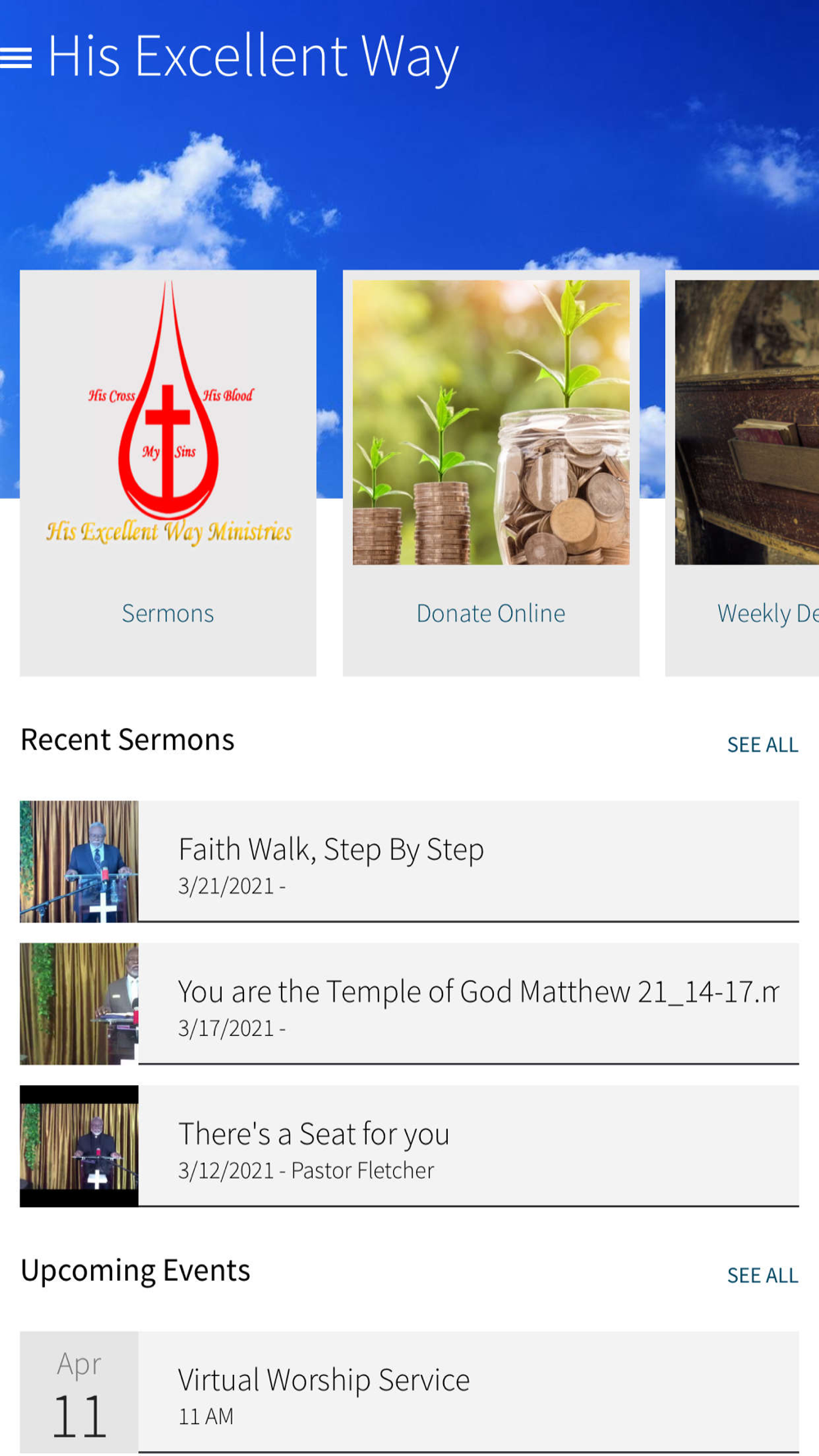 This is the official app for His Excellent Way Ministries. Features such as event calendars, blogs, recent media, document downloads, and more are all quickly available in this easy-to-use mobile app.