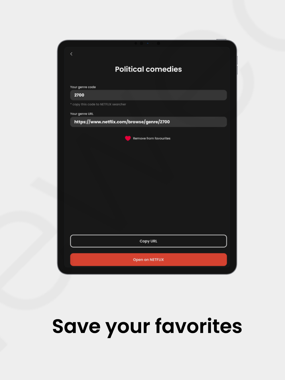 With this application you can effectively filter and display movies and serials on Netflix. Choose a movie according to your current mood from hundreds of genres. Save your favourites, get movie code and open it on Netflix.