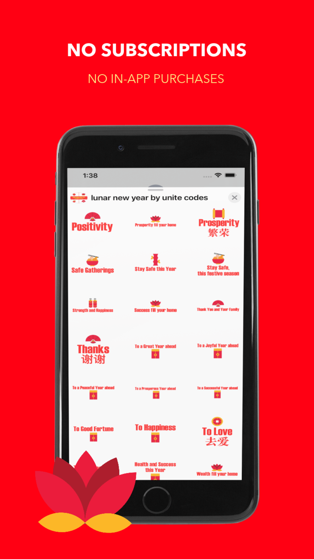 Lunar New Year by Unite Codes has NO HIDDEN FEES for extra access to stickers and NO SUBSCRIPTIONS, Just all your Lunar New Year stickers immediately available to you once purchased.