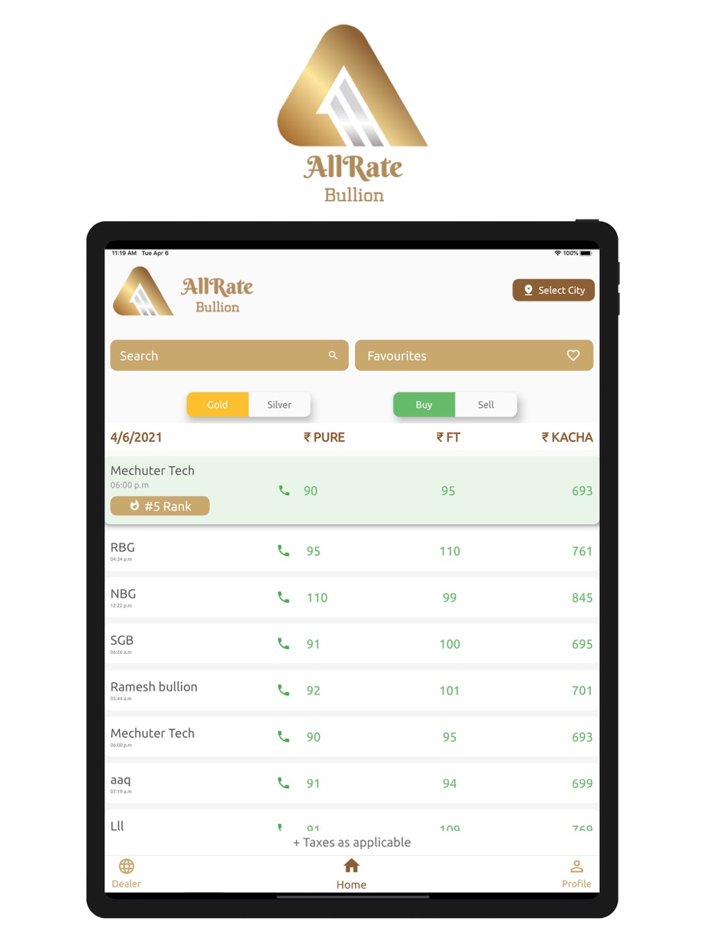 All Rate Bullion is an Application for Dealers and Customers, to track Gold and Silver price movements at their local bullion market, where they usually make transactions.