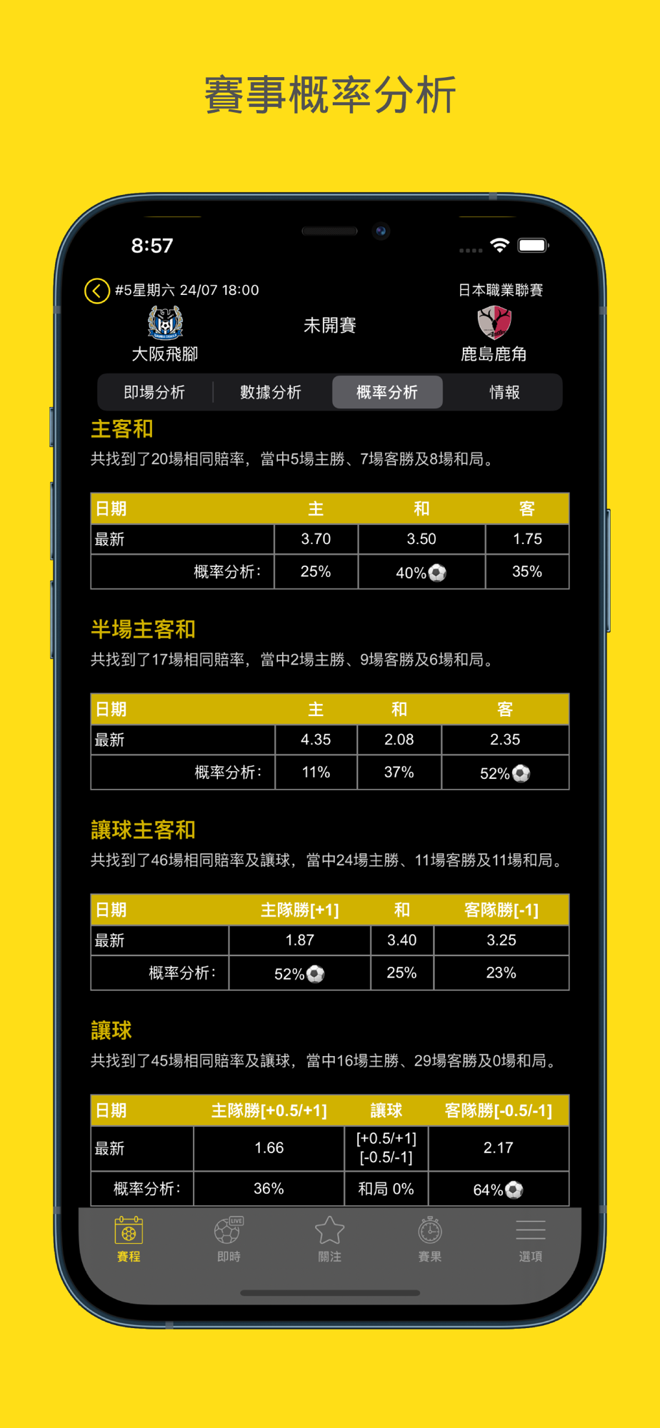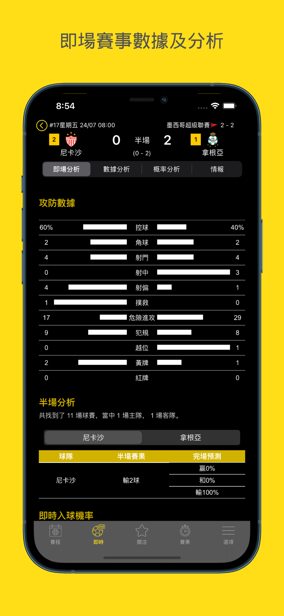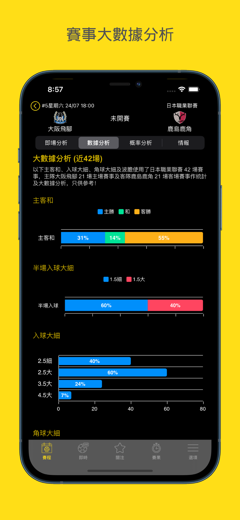 足智大數據使用過萬場賽事結果為你分析即場攻守數據、賽事大數據分析及概率走勢,助你掌握決勝機率。