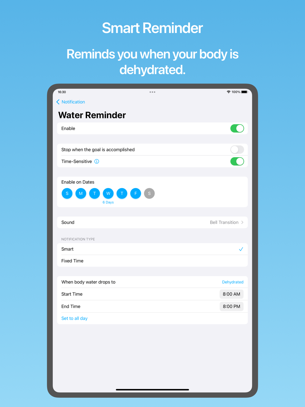 HiWater will remind you to hydrate when your body goes into dehydration. With HiWater's powerful notification system, you can set different rules for weekdays and weekends. HiWater also supports iOS 15 time-sensitive notifications.