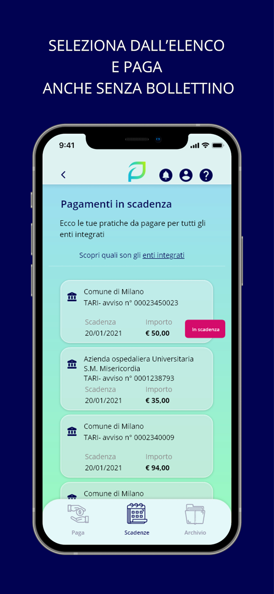 - ricevere notifiche per i pagamenti in scadenza