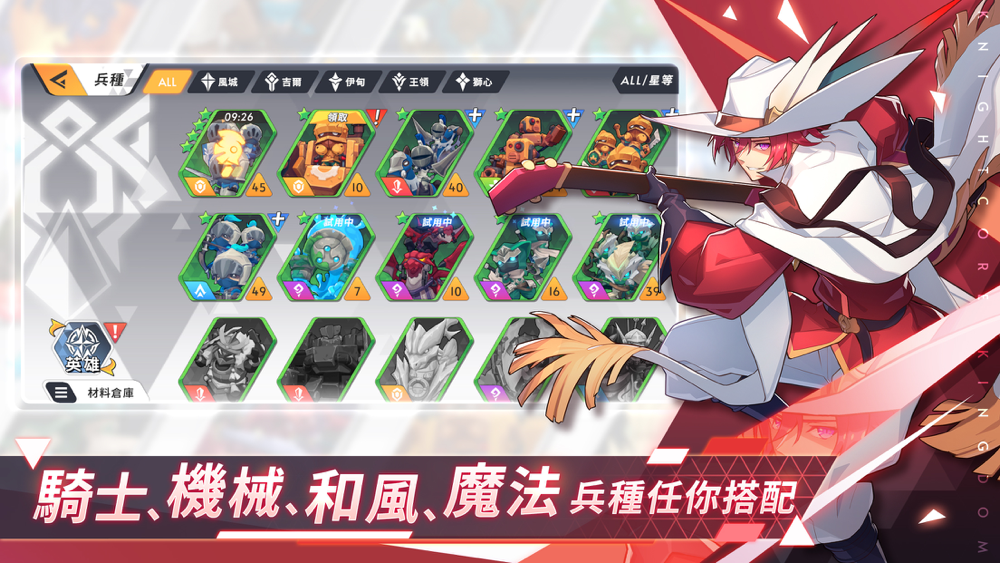 《王領英雄》具有多元的兵種特色,例如發揚傳統騎士精神的風城蘭斯洛特兵種、以科技著稱的吉爾機械兵種、還有來自秘林伊甸城邦的魔法兵種與北方獅心城和式兵種,這些戰鬥單位各有各的擅長能力,等待玩家挖掘各種搭配組合,組建最強軍團。