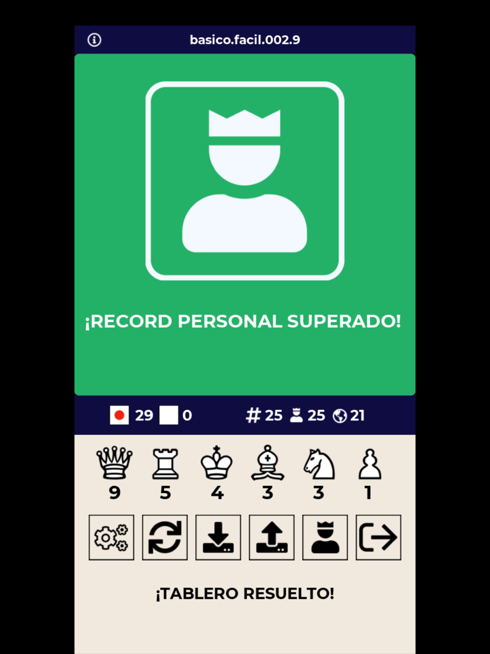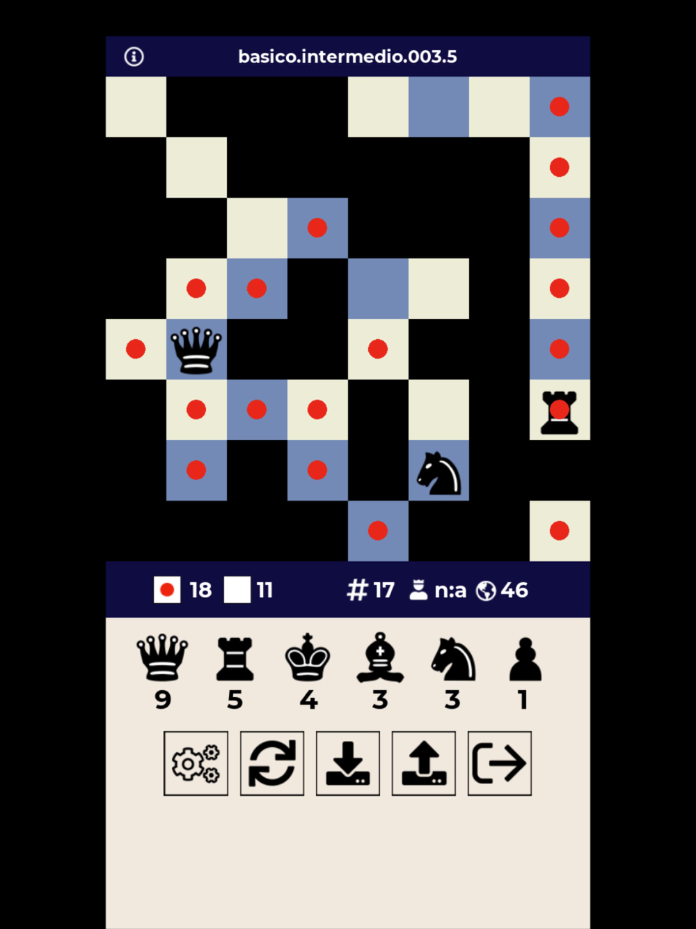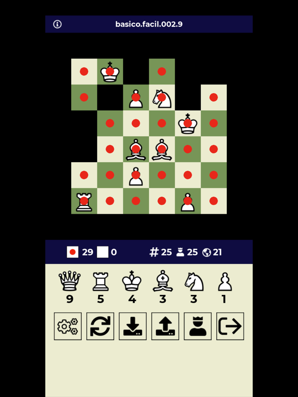 Place pieces on the board so that all the available squares -even those occupied by your own pieces- are under attack and the total value of the pieces used is the lowest possible. Records are updated automatically.