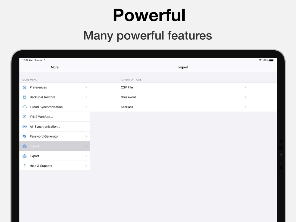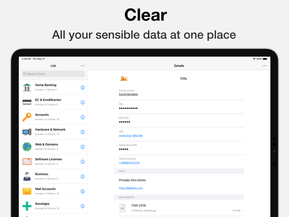 iPIN2 tries to fulfill the KISS principle. iPIN2 was developed to store and display PINs and passwords - no more and no less. So the focus is on simplicity, clarity and high level of security.