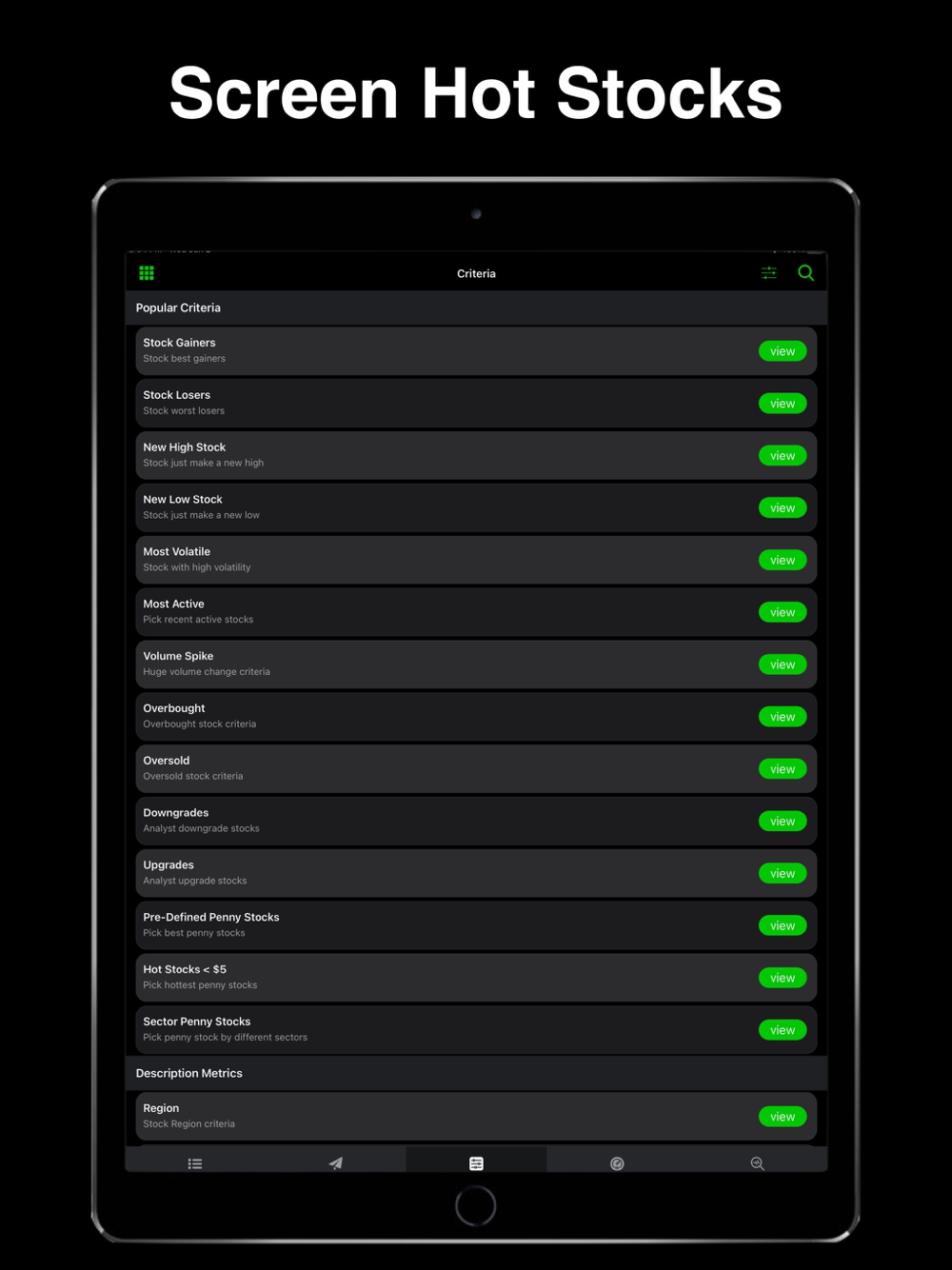 *Provide pre-defined screener criteria such as best penny stocks, unusual options and top gainers