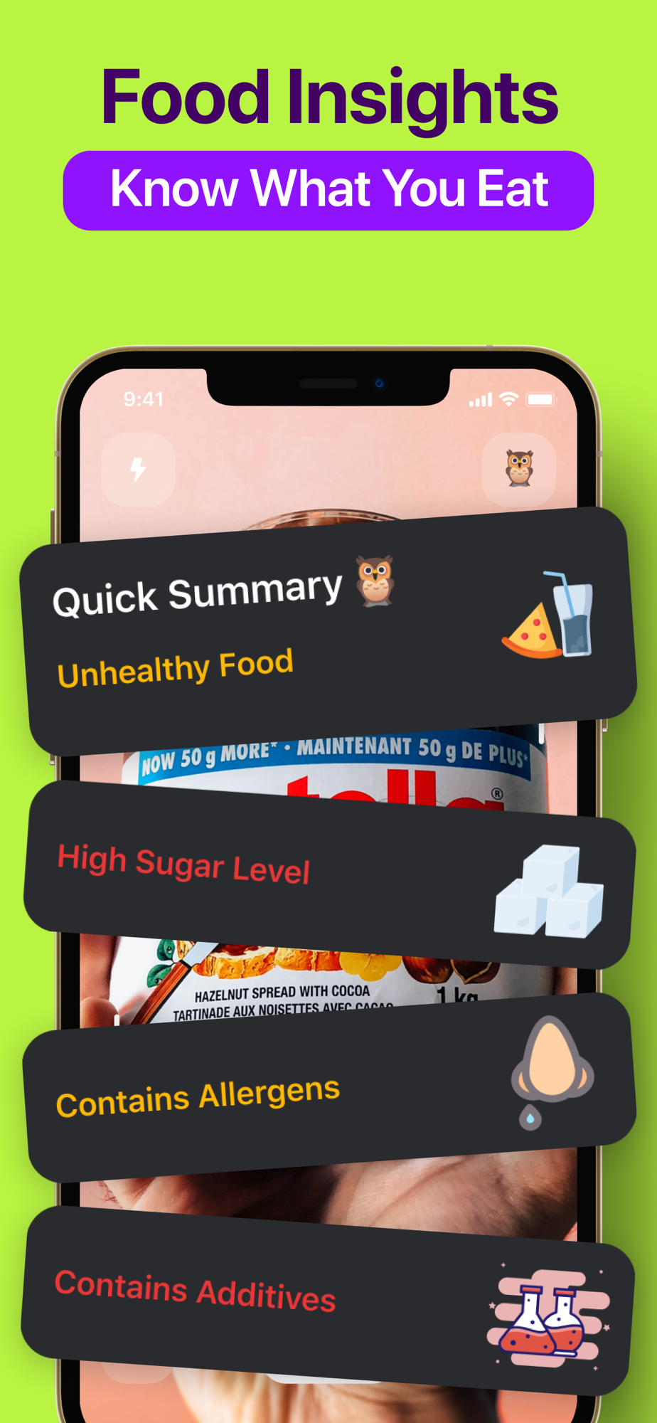 Food Insights - Know What You Eat! Get quick insights into ingredients and nutrients from the world's largest food base with over 1.8 million products. You will see an alert if the product contains harmful additives or may cause allergies.