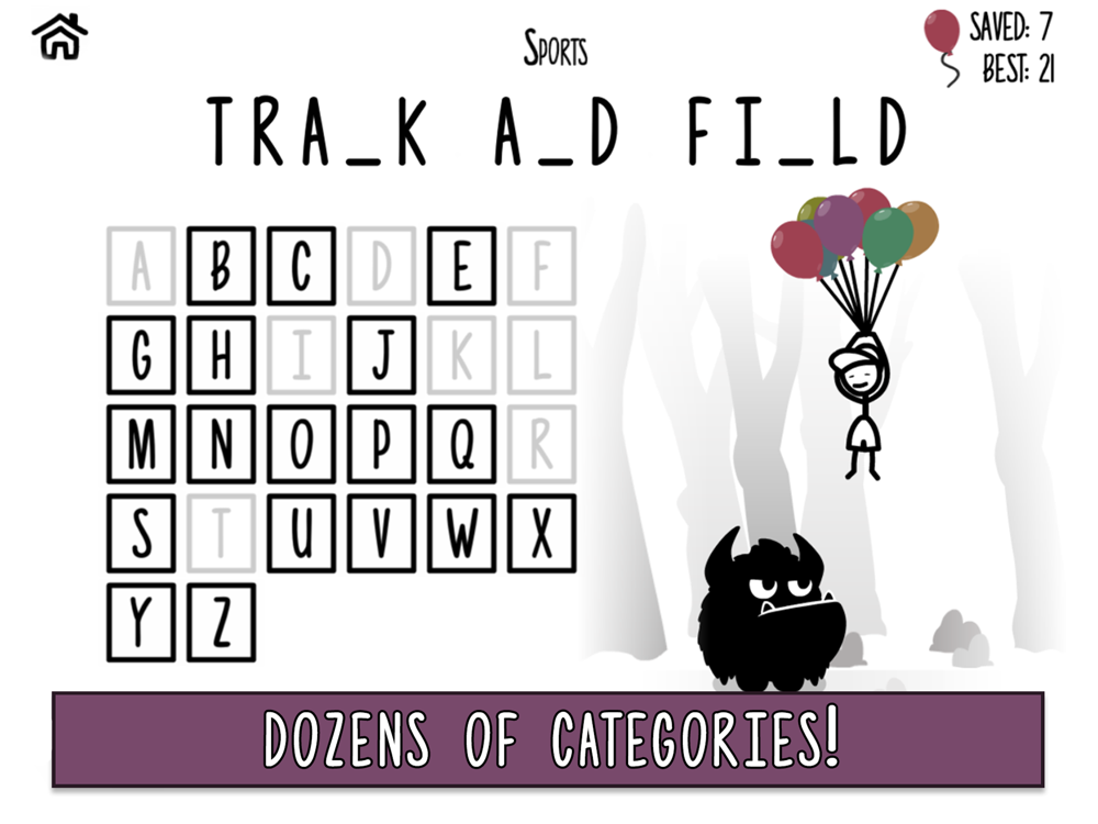 Your goal is to guess the word or phrase to save the player from the hungry monster. Guess one letter at a time to see if it’s in the Hangman word. Tap on a letter to guess it and the letter will fill in a blank space if you guess a letter correctly. If not, you’ll pop a balloon and get closer to falling in the beast’s mouth! Try to guess the word or phrase once you have enough correct letters on the Hangman board.