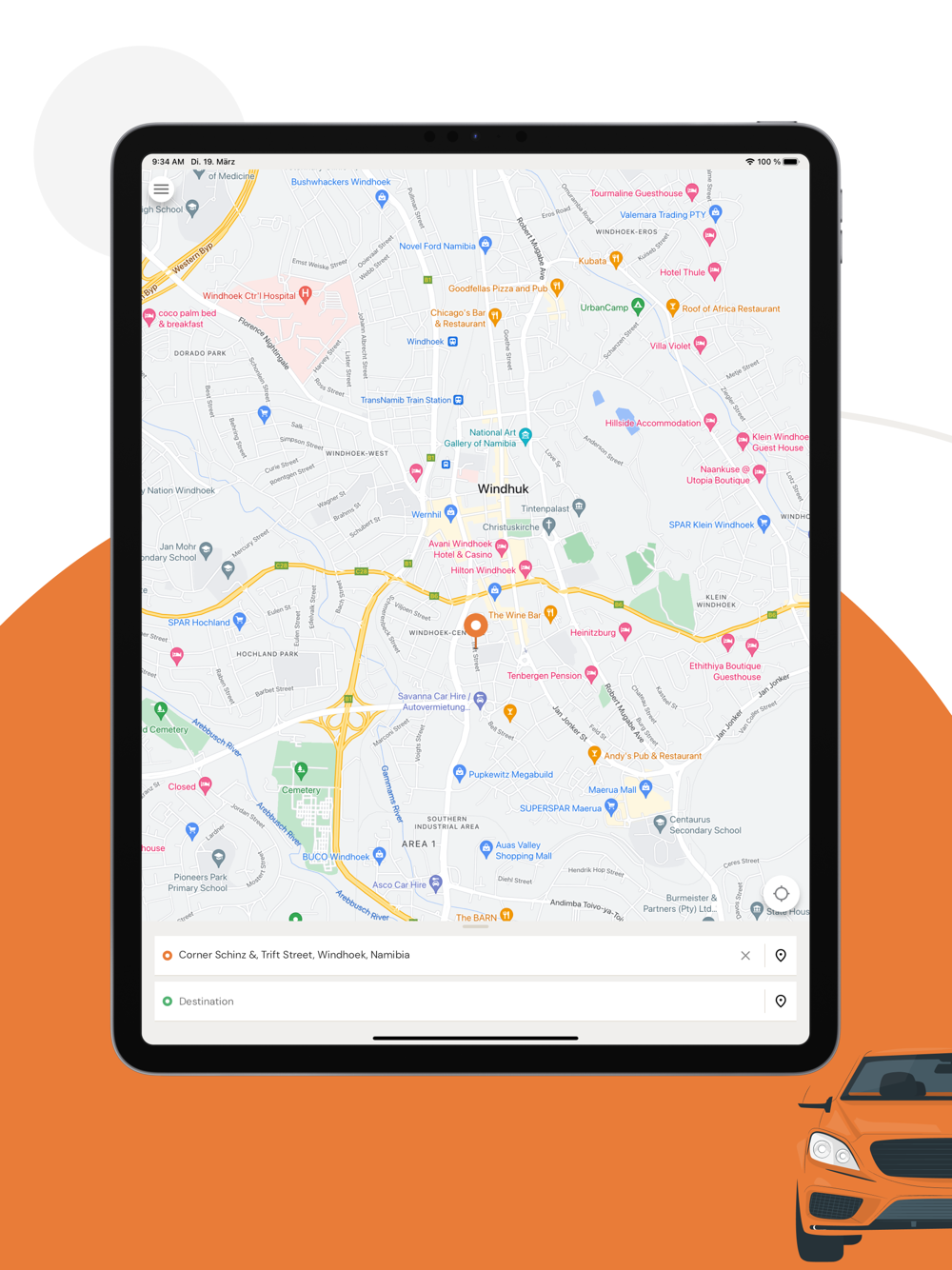 E-Taxi is a transport app for everyone. It is used to order a ride if you need to get from one location to a specific destination around a city or countryside. When developing the app, the attention was on the Africa passenger transport market. The result is an E-Taxi app that offers flexible and affordable rates for every passenger. The app works according to give-and-take offers between transporter and passenger, not according to arranged kilometre rates.