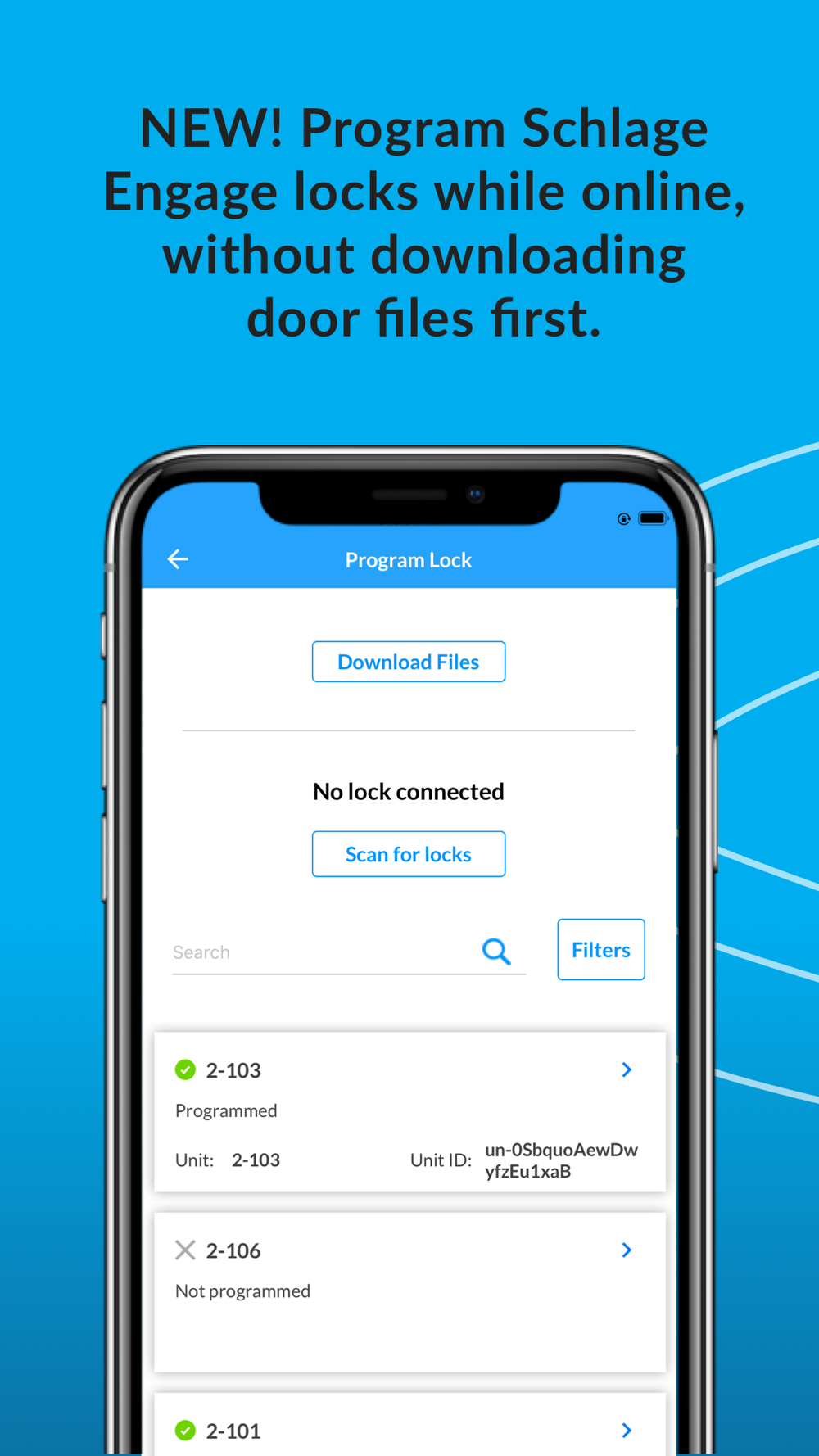 Program Schlage Engage locks (while the app has connectivity to cellular/Wi-Fi, or even when it doesn’t in dead zones and dark hallways)