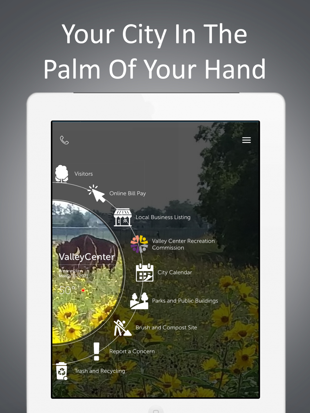 Become a civic resident and engage with your city like never before by downloading the official app. With features like Government, Departments, Local Business Listings, Services, Visitors, Valley Center Recreation Commission, City Calendar, Ask us a Question, and Report a Concern you'll find it easier than ever to stay connected with City of Valley Center, KS with just a few taps on your mobile device.