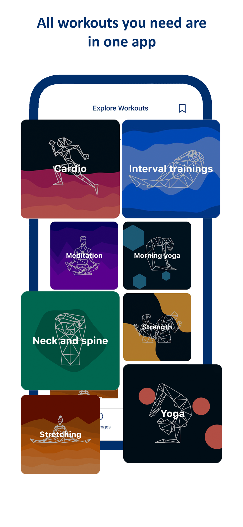 You can do various types of workouts - Cardio, Interval trainings, Yoga, Stretching, Neck and Spine health, Strength, Morning yoga, Meditation and more.