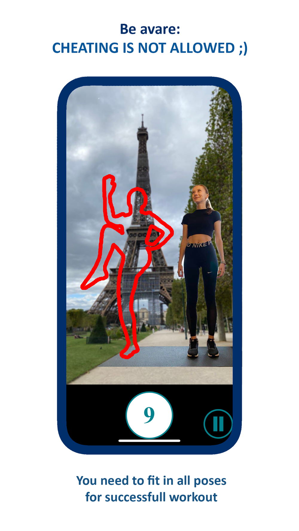 Our application will track your movements during workout and not allow you to cheat even while training at home. You don't need any special equipment - just your device with front camera and desire TO BE IN SHAPE!
