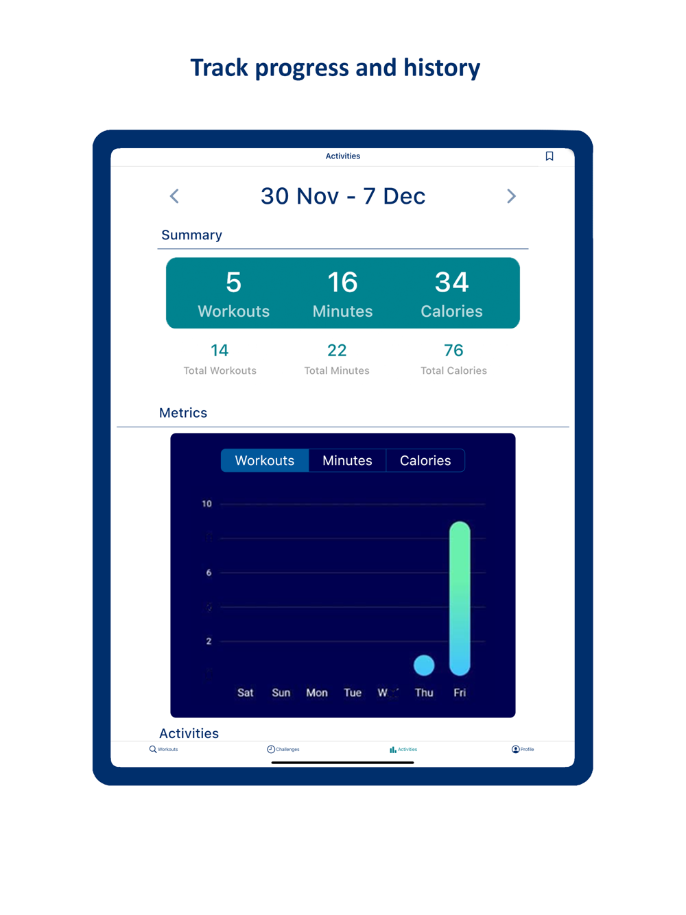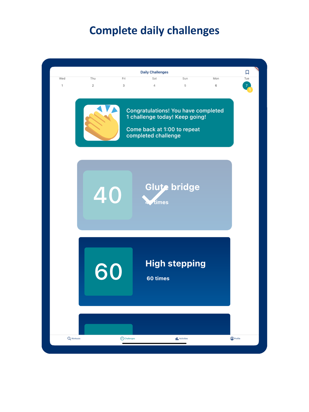 Find daily challenges inside the app! Challenge yourself to complete at least one exercise every day and see how your body evolves. Track history and activities to see everyday progress you make while training.