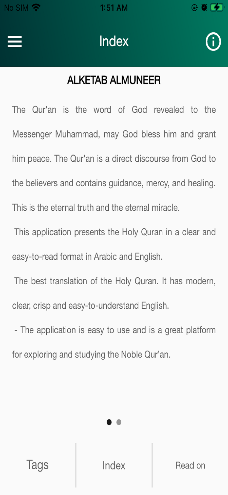 This application presents the Holy Quran in a clear and easy-to-read format in Arabic and English.