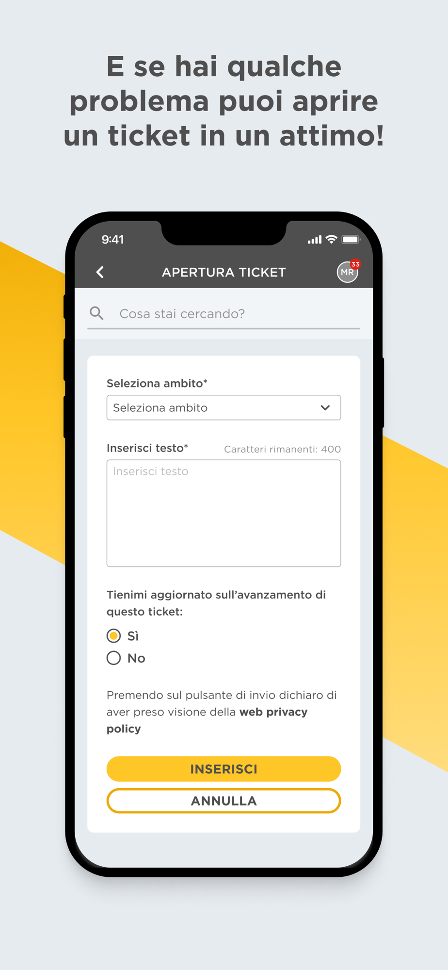 Siamo sempre con te! Ti basta aprire un ticket direttamente nell’app per inviare le tue segnalazioni e ricevere supporto immediato.