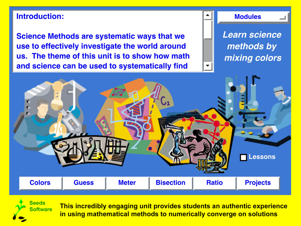 This App uses a very fun and engaging activity involving mixing three primary colors to match a given specimen of unknown mixing. The challenge is to find the combination of primary color intensities that make up the target specimen color in as few test tries as possible.