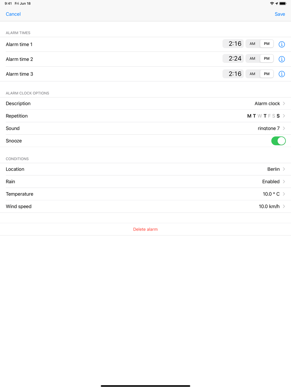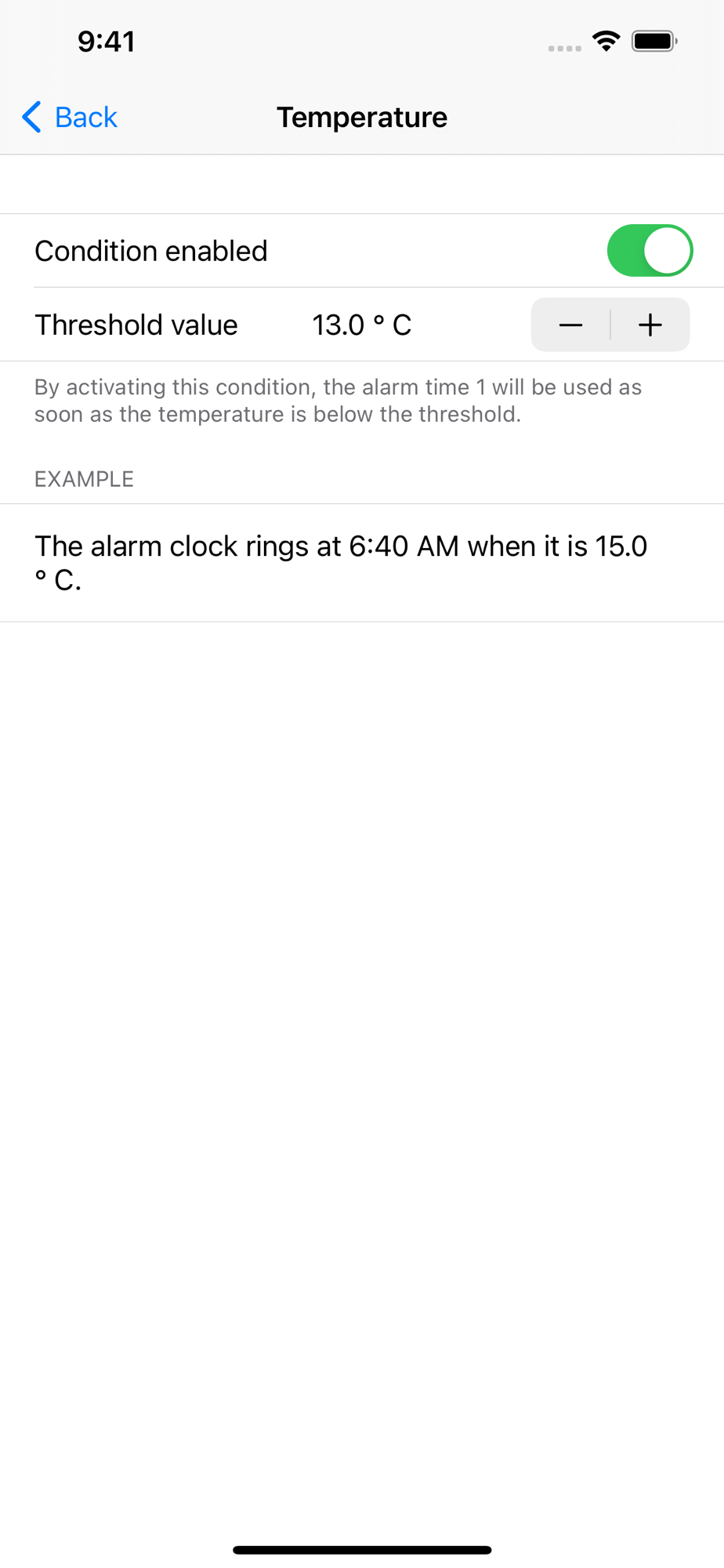 The alarm clock rings at different times depending on the weather. So you can sleep longer if you have to go by car or public transport in rainy weather. On the other hand, if the weather is nice, you can get up earlier and ride your bike to work or school.