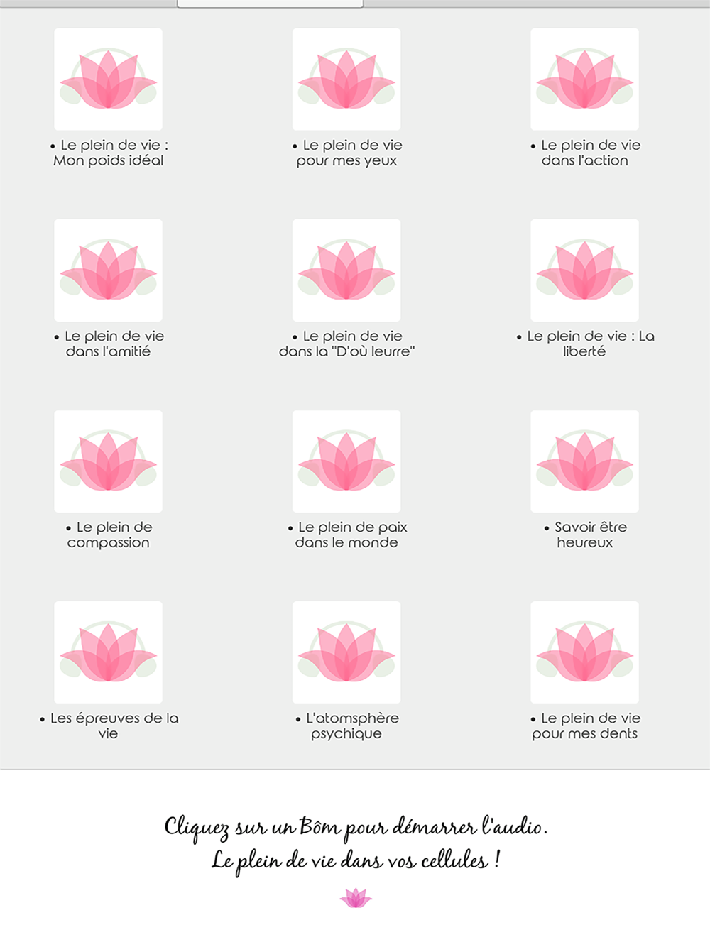 Une véritable bibliothèque audio prête à l'emploi et sur-mesure pour chacune de vos humeurs, chacun de vos besoins du quotidien, regroupée dans une application ne nécessitant pas d'accès au WI-FI pour vous permettre à tout moment de vous relaxer et méditer sur des points précis.