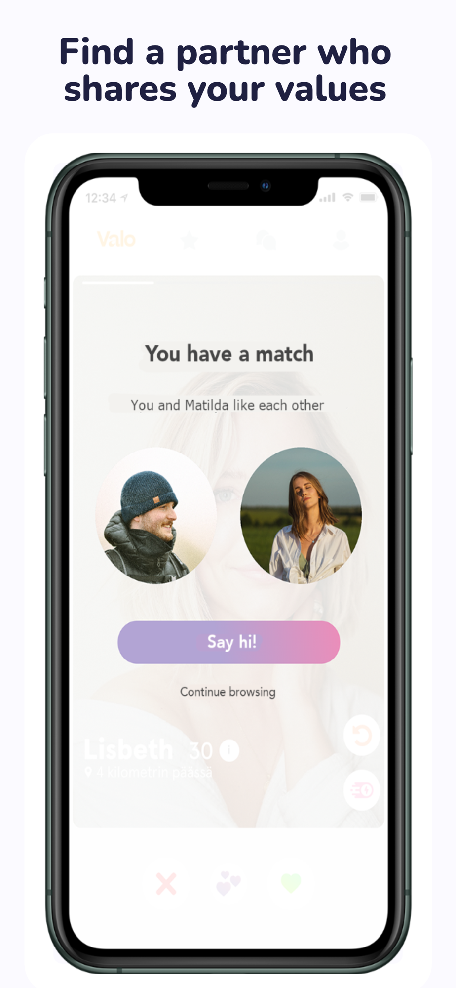 On Valo you will meet people with whom you share the same values and interests. The app is simple to use: you can like other users and when they like you too, you make a match and will be able to start a conversation on the app.