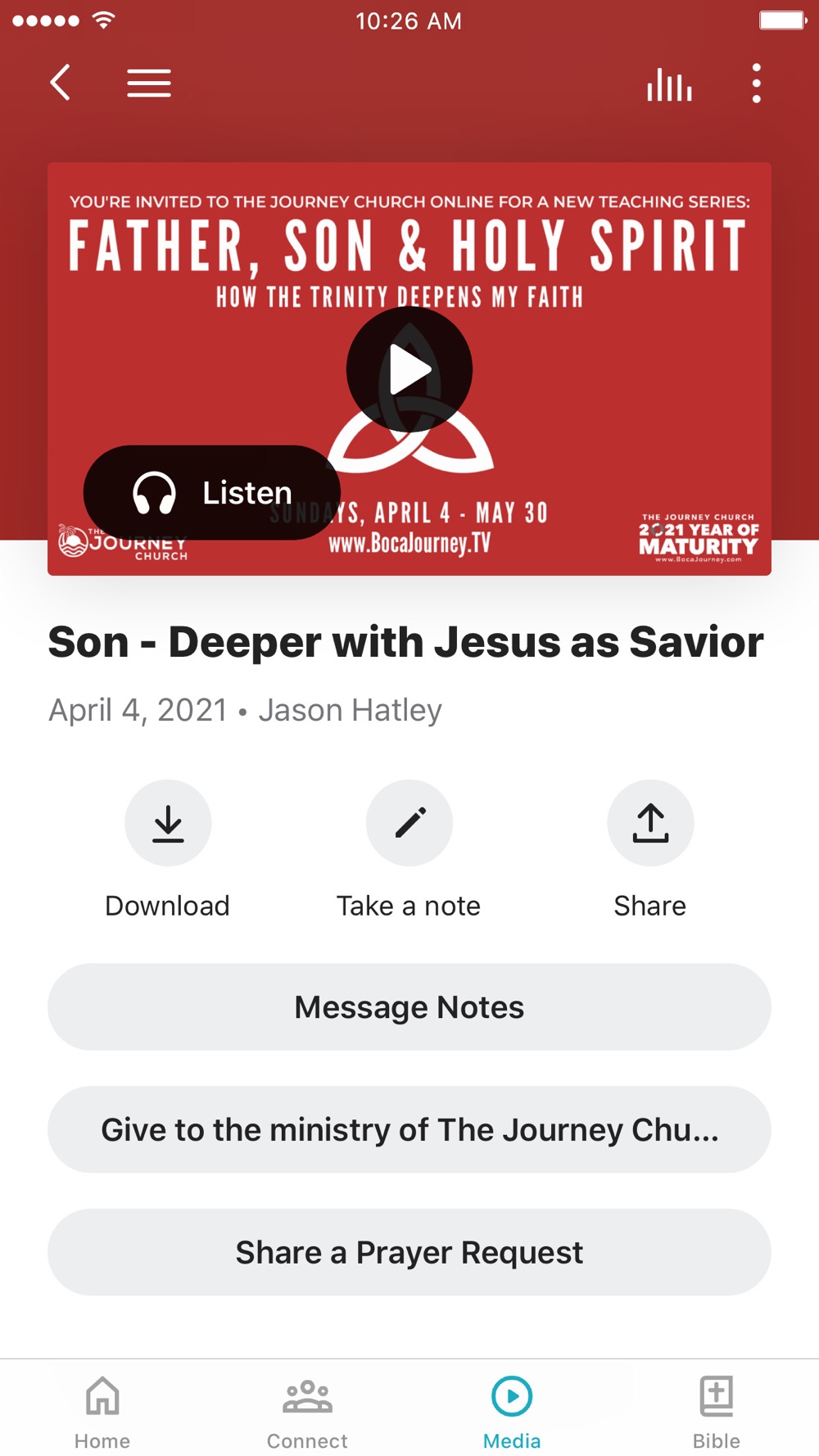 This app will help you stay connected with the day-to-day life of our church. With this app you can: watch or listen to past messages; stay up to date with push notifications; share your favorite messages via Twitter, Facebook, or email; and download messages for offline listening.