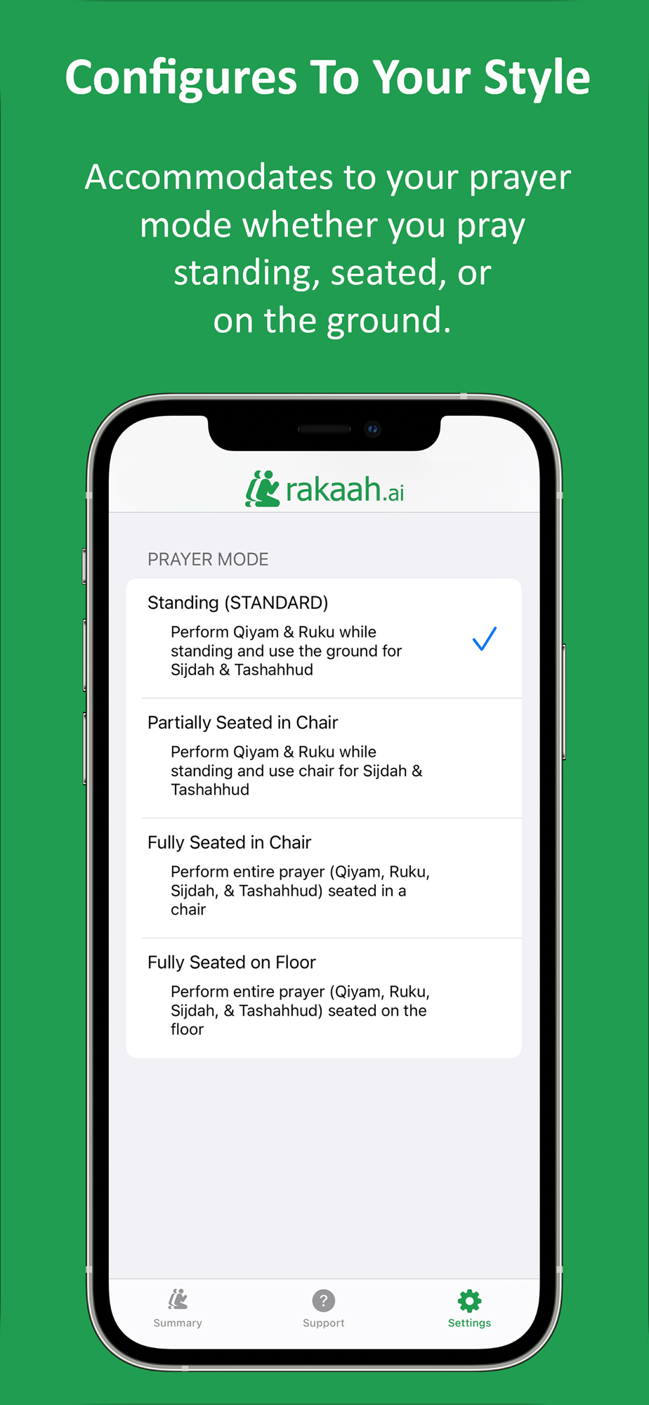 Complete prayers with the confidence of having performed each Rakaah properly by receiving notification via audio, haptic/vibrating, or visual alerts of Rakaah count during prayers or after prayer completion.